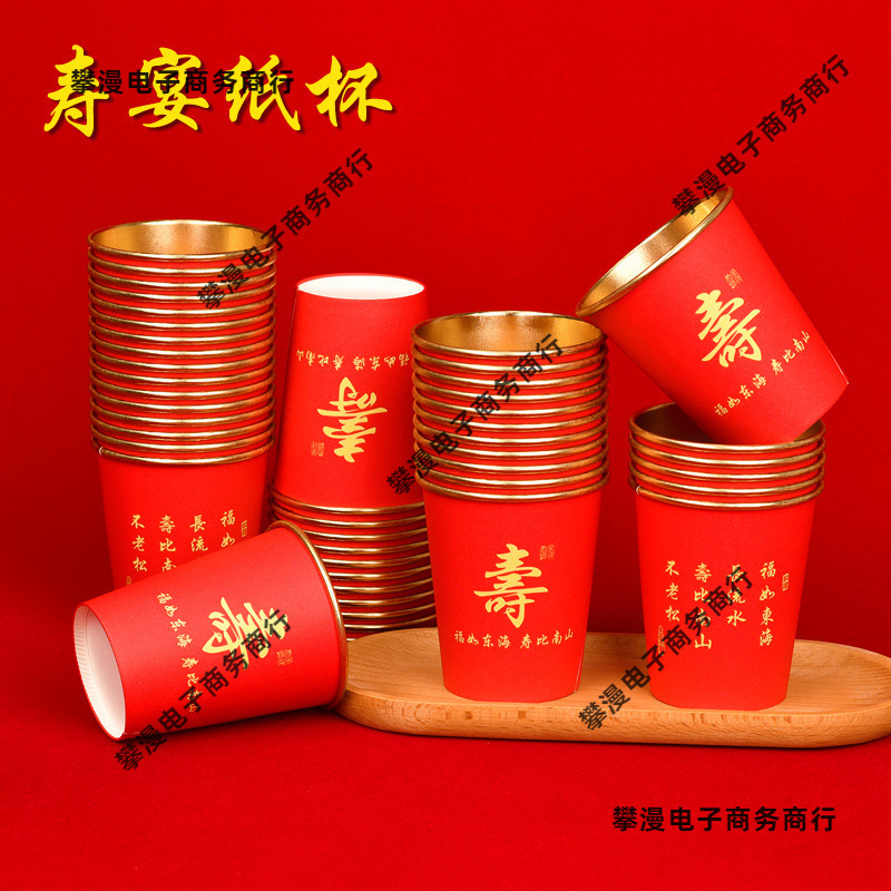 寿字金箔纸杯250ml加厚加硬老人过寿家用宴席红色喜杯可批发