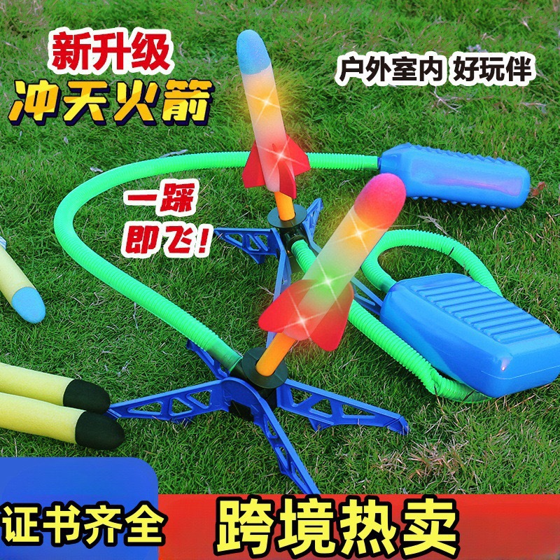 国境を越えた大規模の発光弾射閃光ロケット砲屋外の子供の足が突天砲ロケット砲を踏んで露店のおもちゃを並べます。