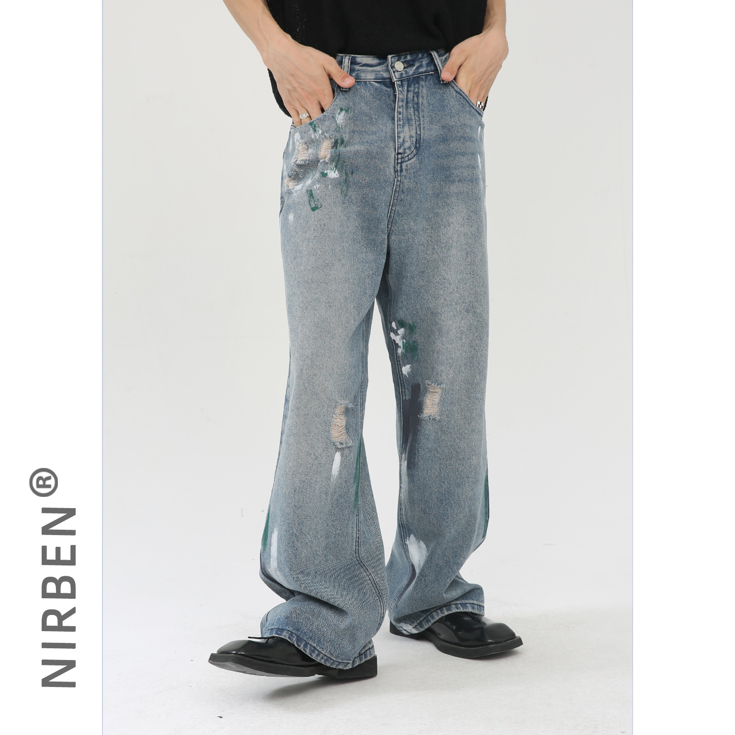 Nirbenカウボーイ | バリ洗水手描き広脚ジーンズ男潮牌アメリカ街頭ゆるいストレートパンツ