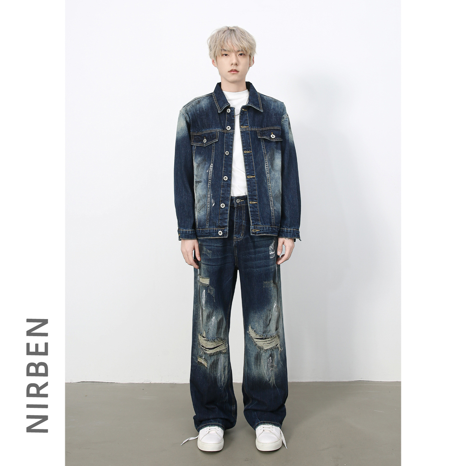 Nirbenカウボーイ | アメリカのレトロな古いデニムのスーツのジャケットの水洗いのゆるいストレートパンツ