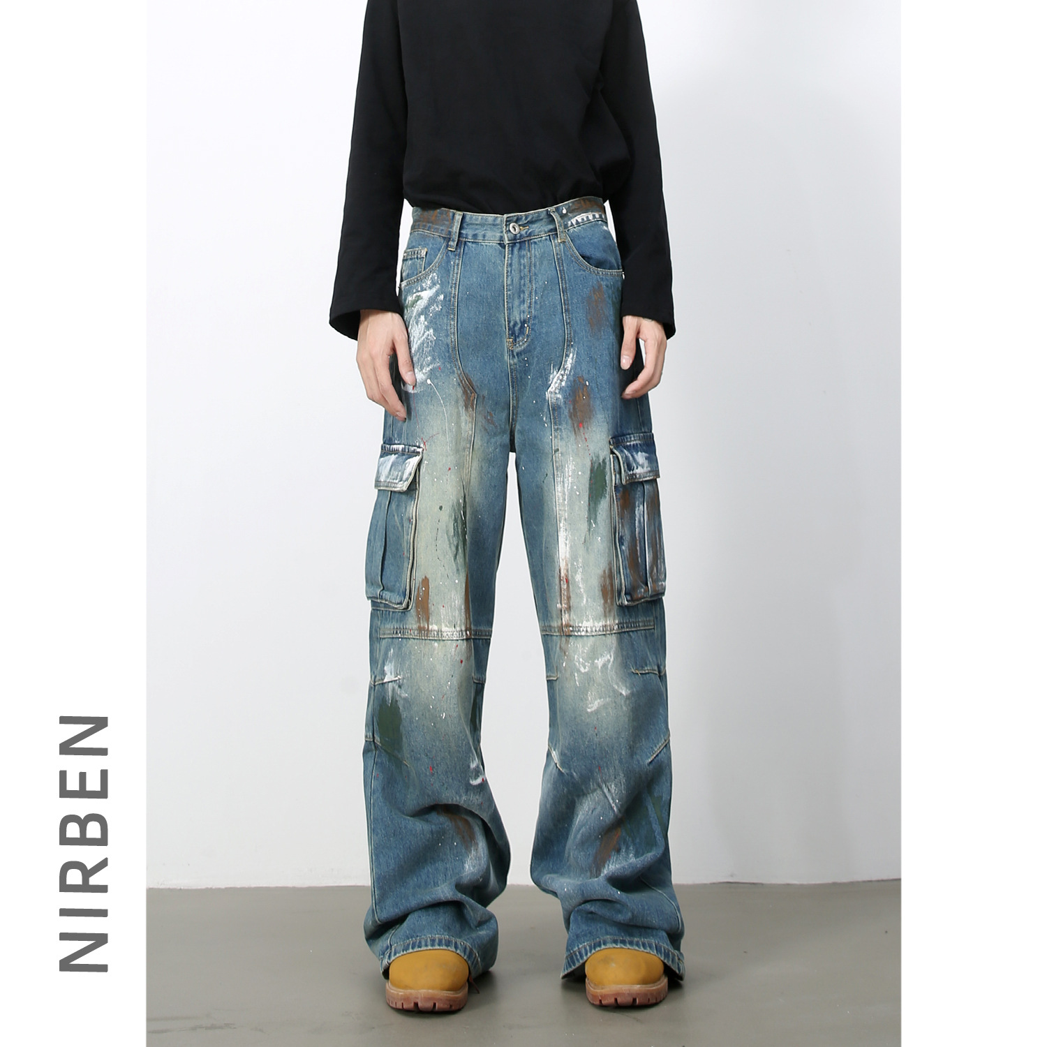 Nirbenデニム | 落書きマルチポケットブルー広足ジーンズ男性アメリカ式高街ゆるいストレートパンツ