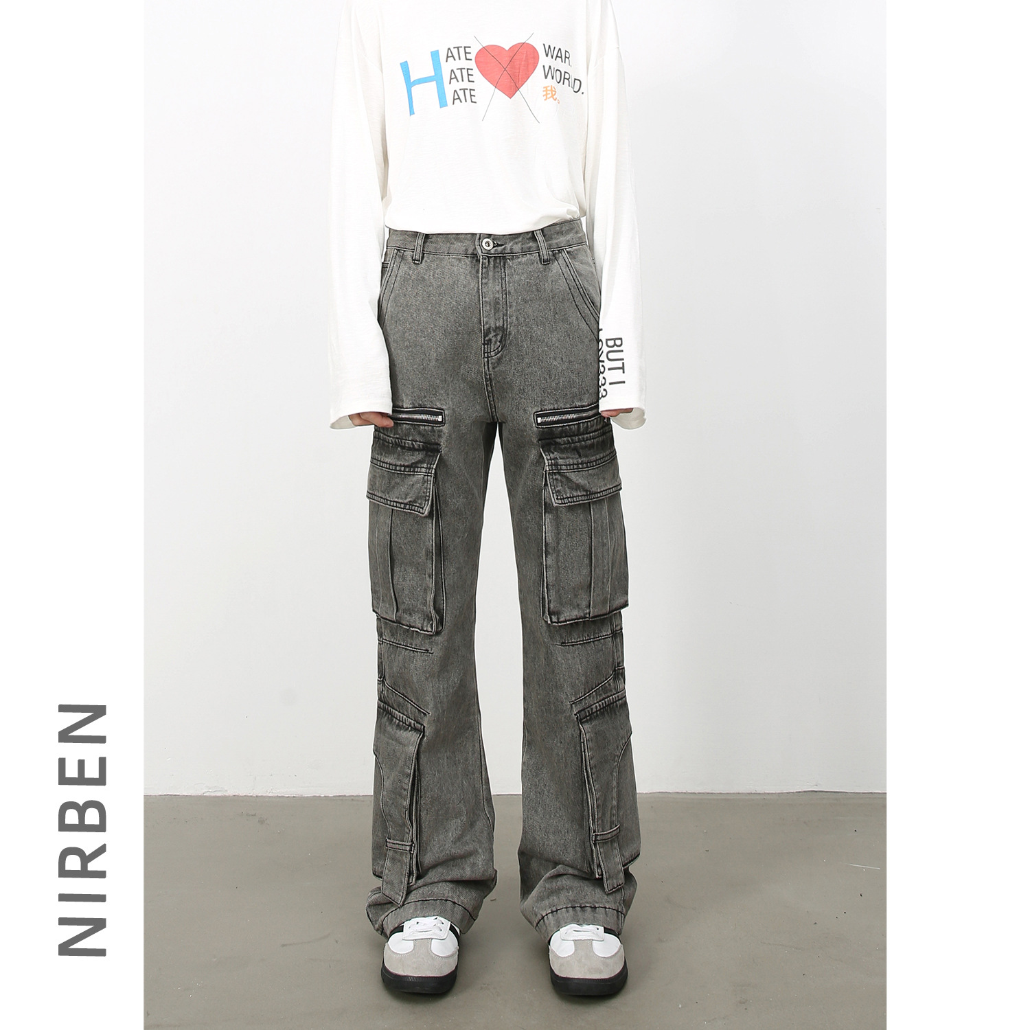 Nirbenデニム | アメリカの多ポケットジーンズ男性レトロでゆるいストレートパンツ