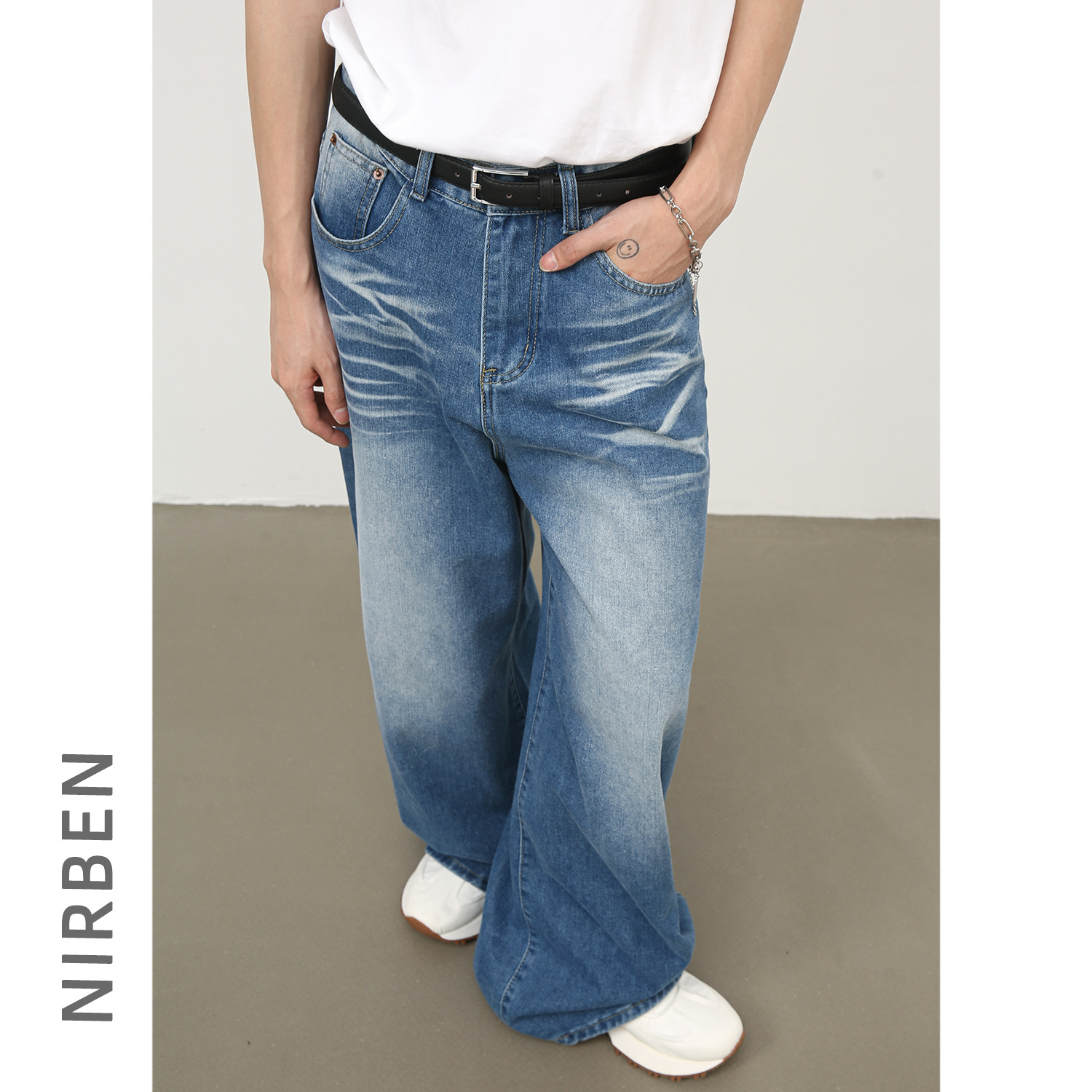 Nirbenデニム | 重工水洗いワイド脚ジーンズ男新品潮牌高街ゆるいレトロストレート長ズボン