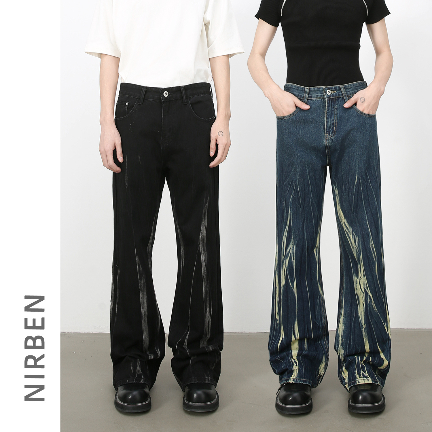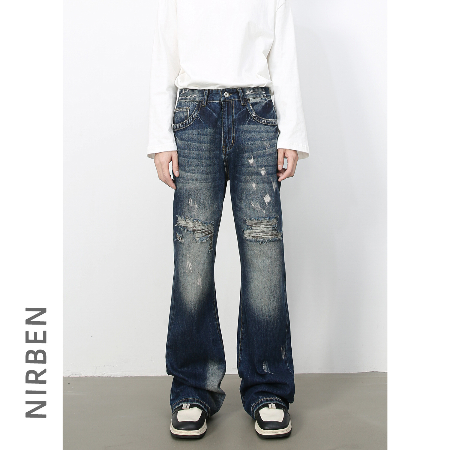 Nirbenデニム | 新品アメリカンハイストリートマイクロラッシングジーンズ男性ゆるいストレートカジュアル百合ズボンファッション