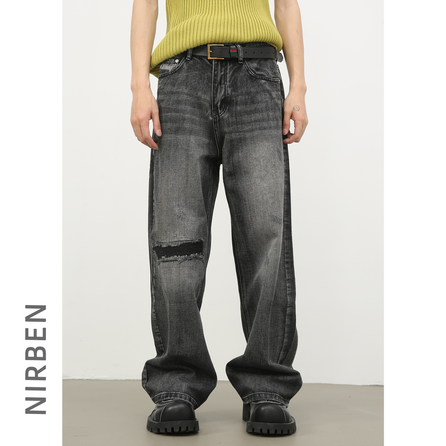 Nirbenカウボーイ | 潮牌水洗いレトロな穴の開いたジーンズ男性アメリカの広い足のカジュアルなゆるいストレートパンツ