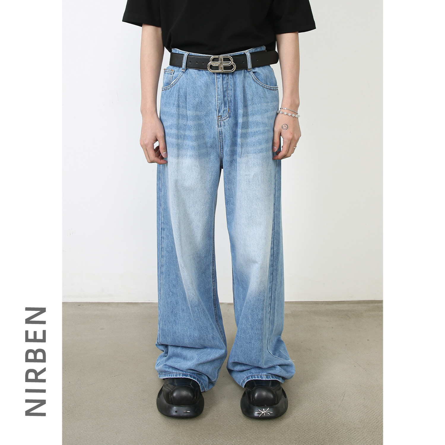 Nirbenデニム | レトロ水洗い水色工装ジーンズ男性ファッションブランドゆるいストレートワイドパンツ