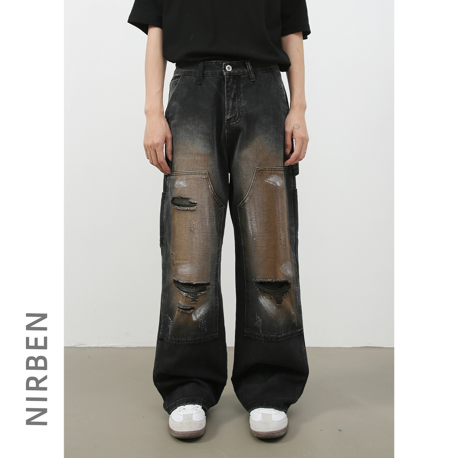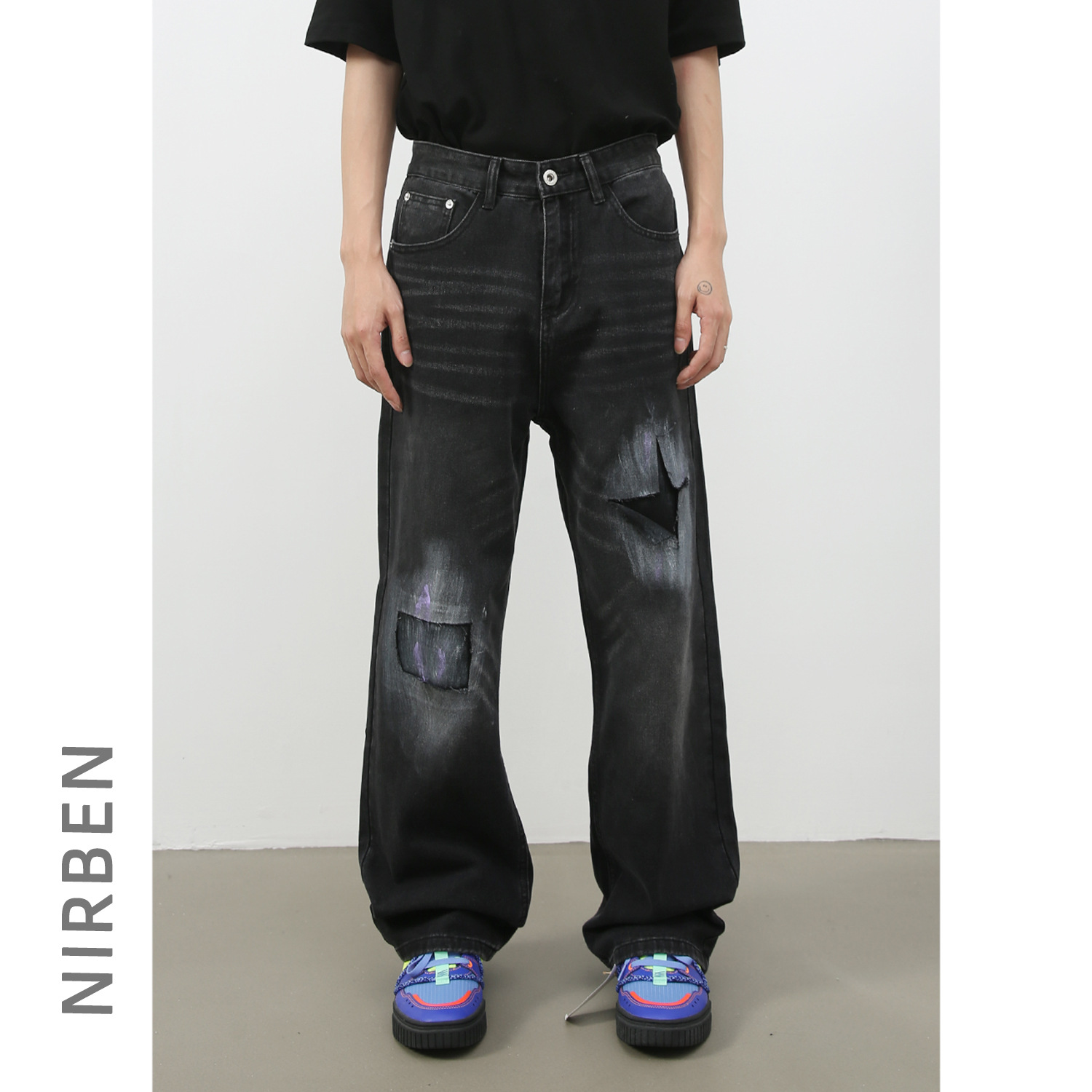 Nirbenデニム | ハイストリート黒の穴が開いたアメリカのストレートジーンズ男性のデザイン感がゆるいワイドパンツ
