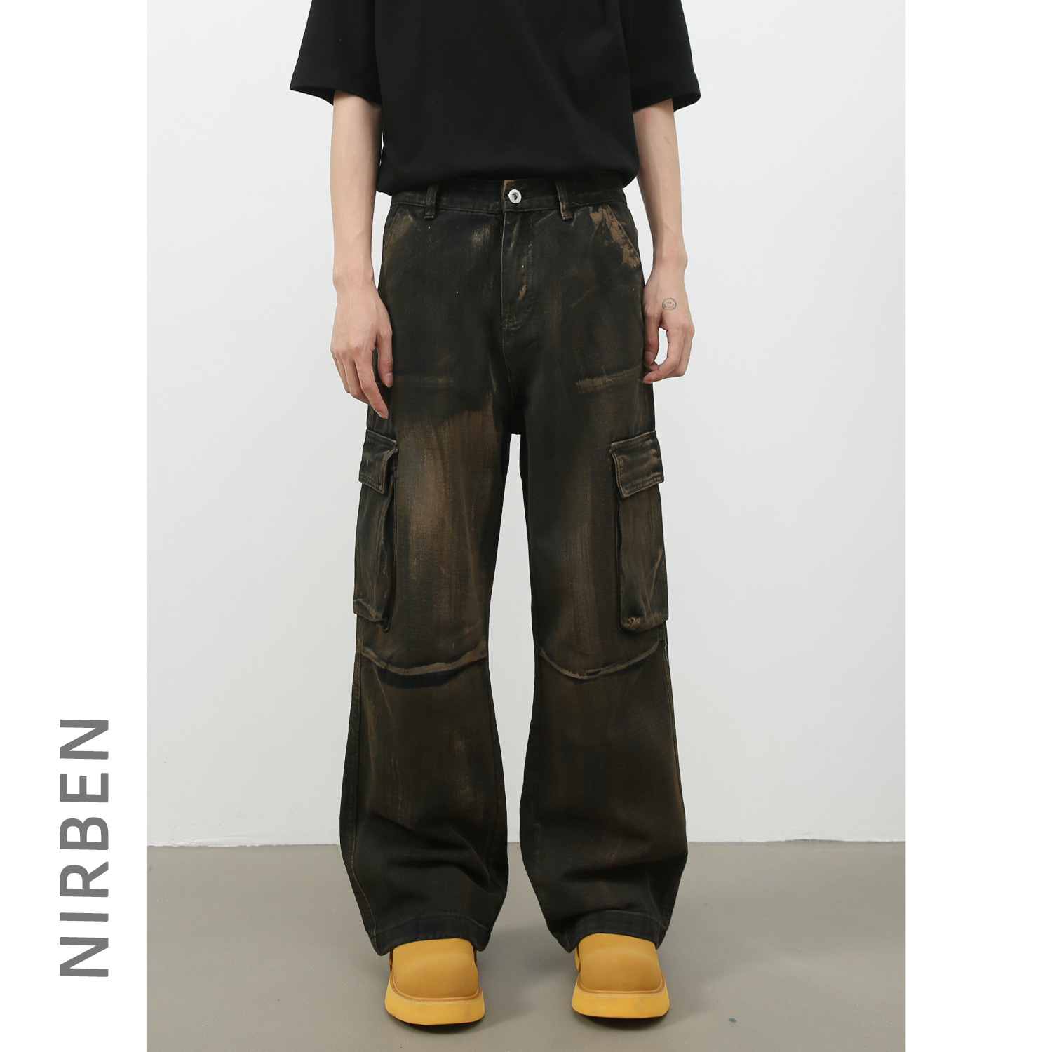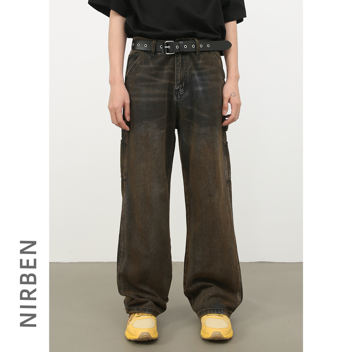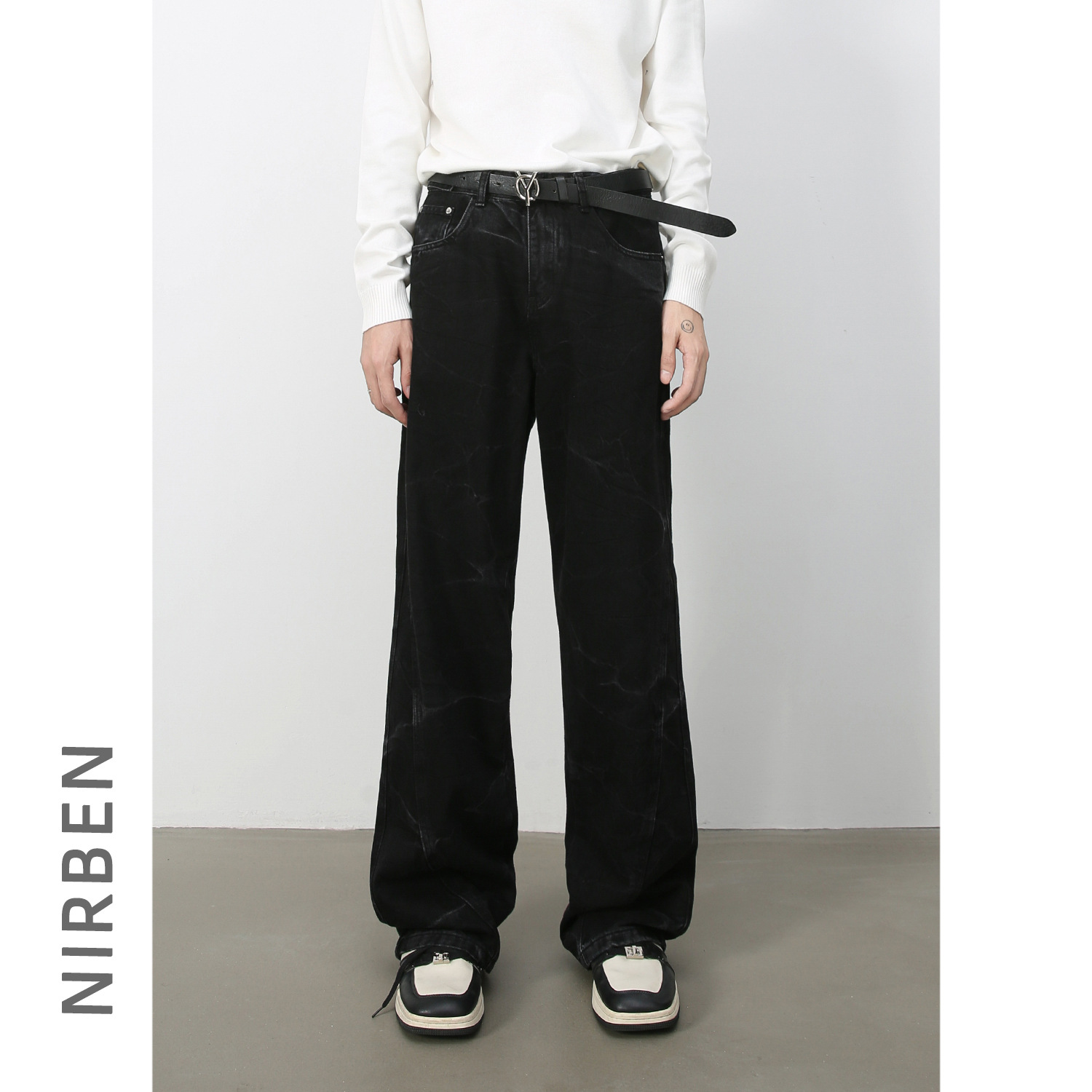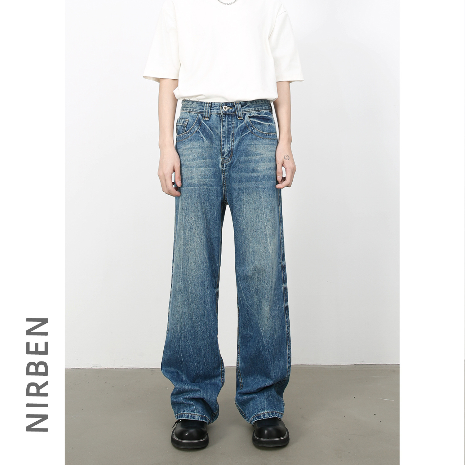 Nirbenデニム | アメリカンハイストリート立体シャーリングセンスジーンズメンズゆるいストレートワイド脚ロングパンツ潮