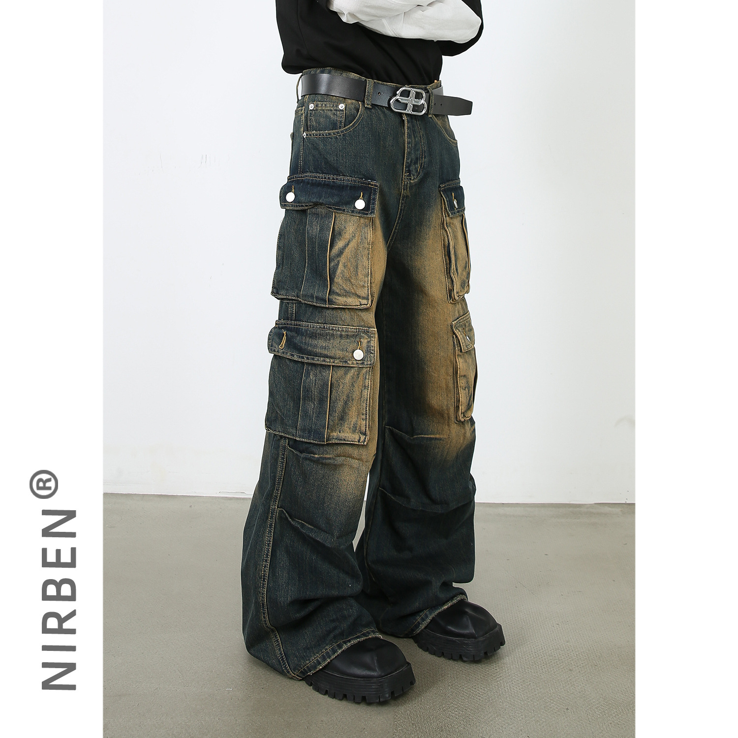 Nirbenデニム | アメリカンvibeレトロ迷彩大ポケット工装ジーンズ男ゆるいストレートワイドパンツ