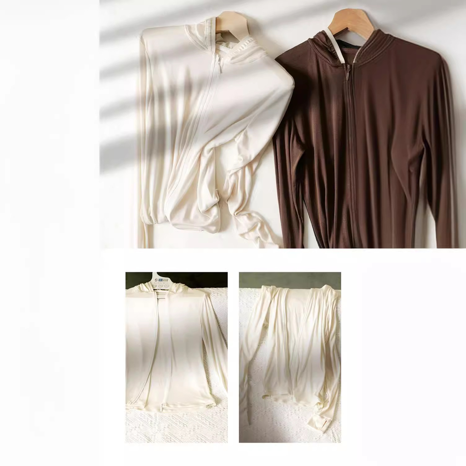 初秋の必需品、日焼け止め機能を備えたシルクの薄い女性用コート、ファッショナブルで多用途、肌に優しく快適な女性用スリミングトップ