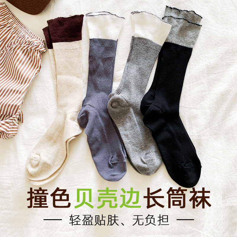 秋の新型の基礎韓国版の無地の坑条綿の手縫いの女性の中筒の靴下の高弾の快適な靴下の女性