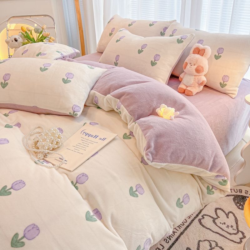 Ins風冬牛乳絨毛紫チューリップ布団カバー4点セットサンゴ絨毛保温シーツ3点セット
