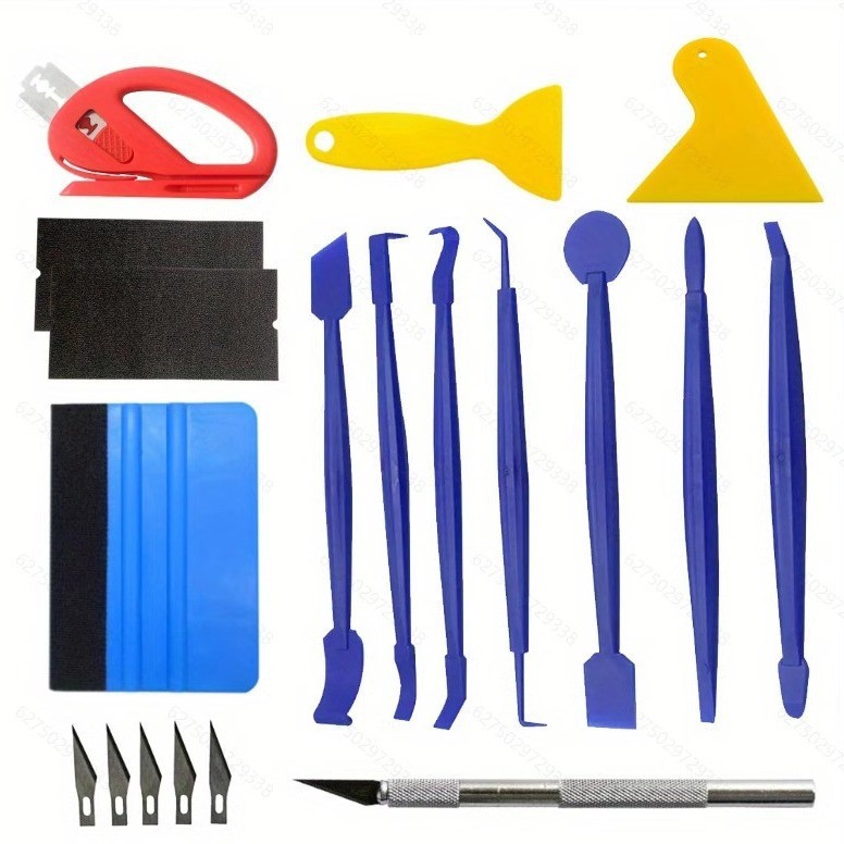 19点セットの窓貼り付けツールセットには、フェルトのスクレーパーが伸縮可能な実用刀とボタンの刃が含まれています。