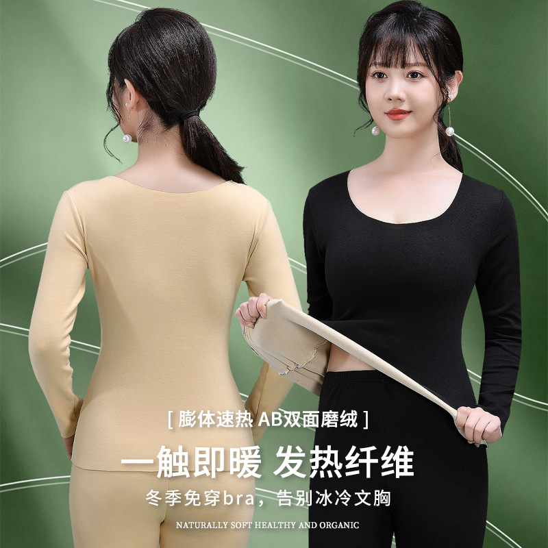 秋冬の丸首のウールのシルクの保温の上着は腹の底の服を収めて胸のパッドを持って秋の服の秋のズボンのスーツの女性を厚くします。