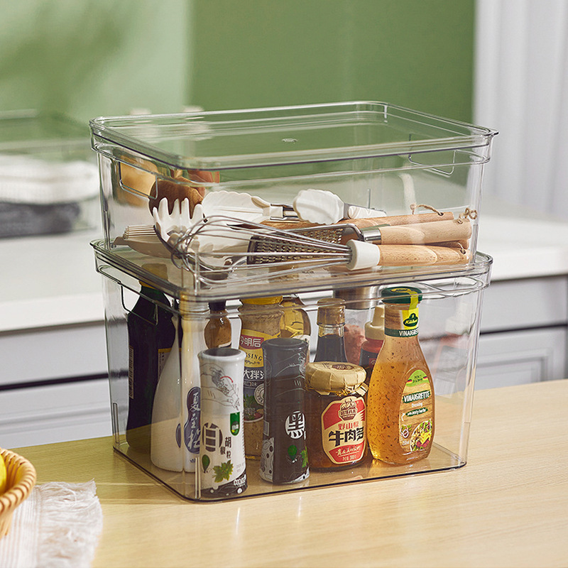 手提げプラスチック収納ボックスデスクトップ大透明調味料調理器具整理ボックスキッチン冷蔵庫収納ボックス
