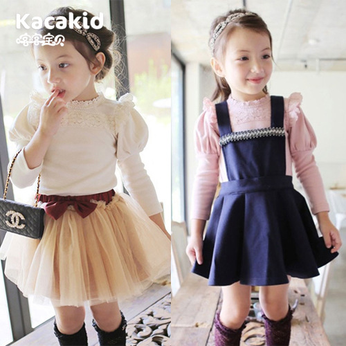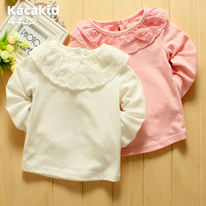 在庫一掃特価 春秋 女の子用 可愛いレース付き長袖トップス 無地パフスリーブ プリンセス風インナーシャツ 卸売