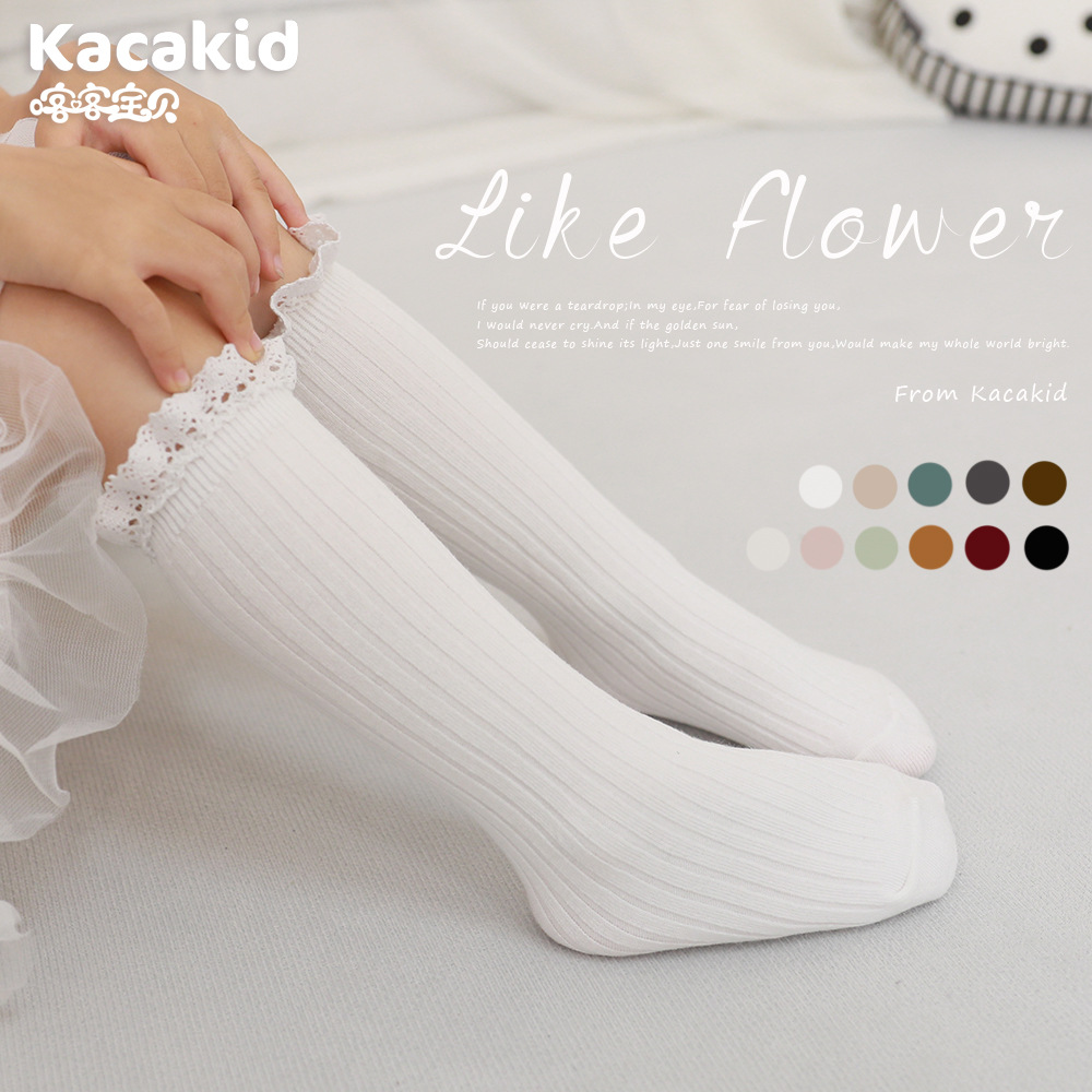 蕾丝边儿童中筒袜春秋女童花边袜百搭精梳棉女宝宝无跟竖纹亲子袜