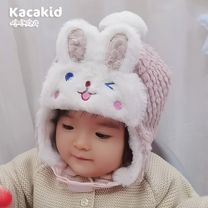 秋冬の新型ベビーキャップキャップを卸売りします。男女の赤ちゃんの毛玉ボールのウサギのぬいぐるみの耳保護帽2119