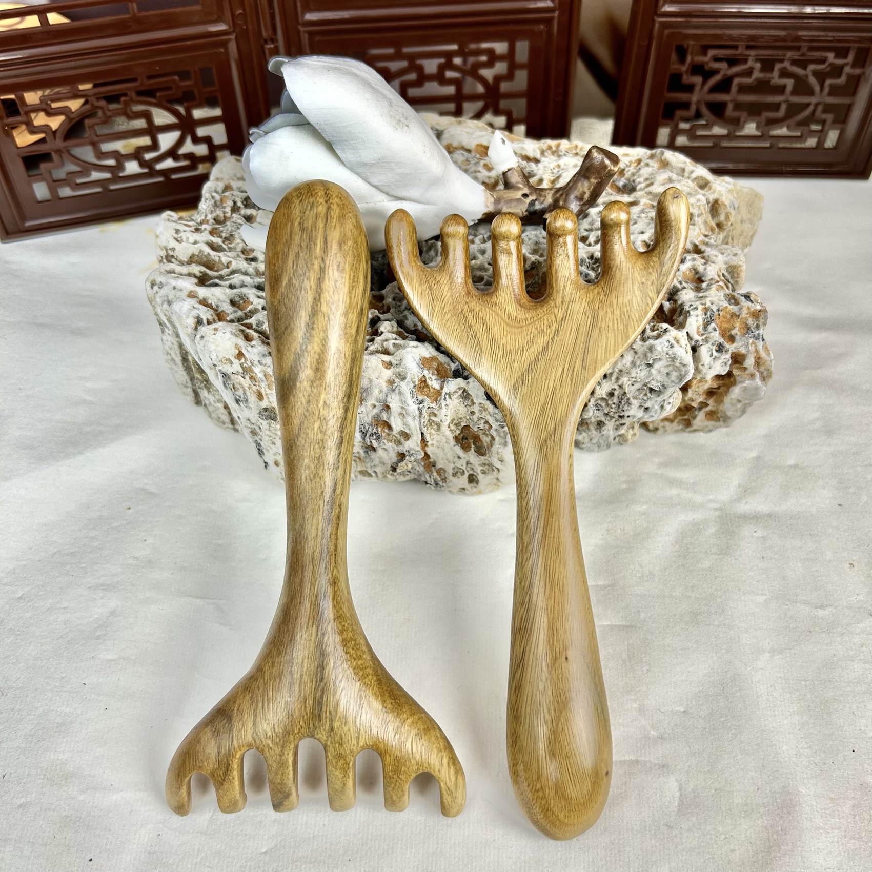大きいサイズの緑檀月は逸品の木の櫛を櫛にしてマッサージします。