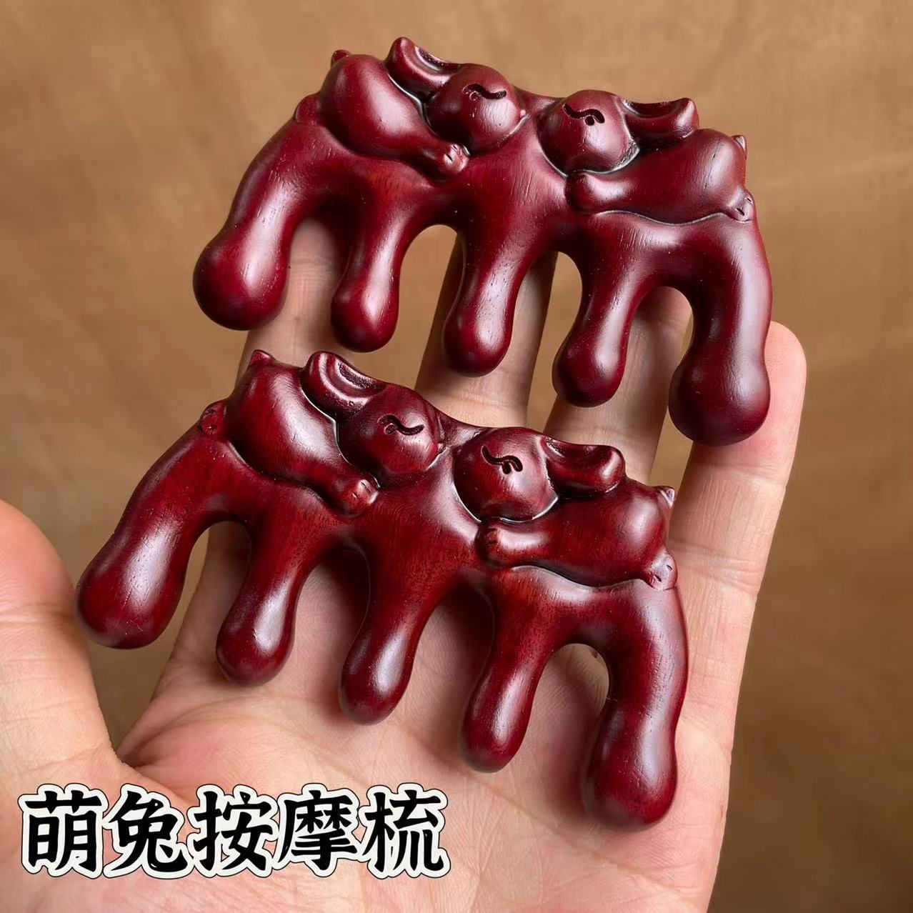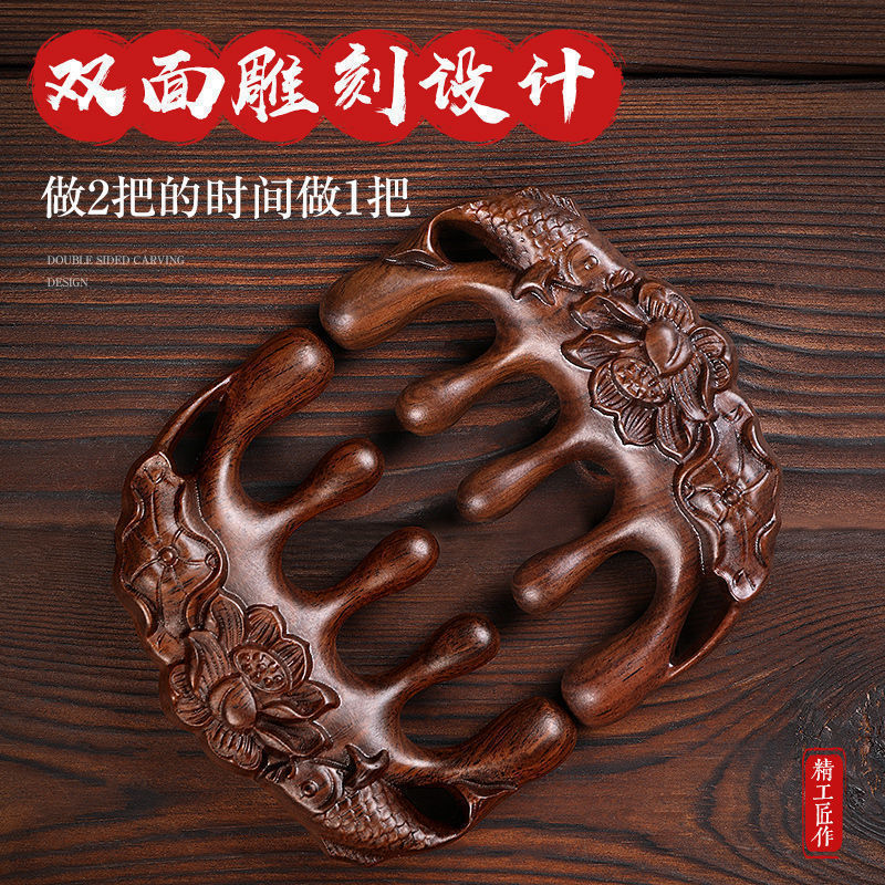 紫檀木彫刻マッサージ櫛養生両面彫刻ハスの花ウサギの経絡防止マッサージ脱毛頭の大きな丸い歯