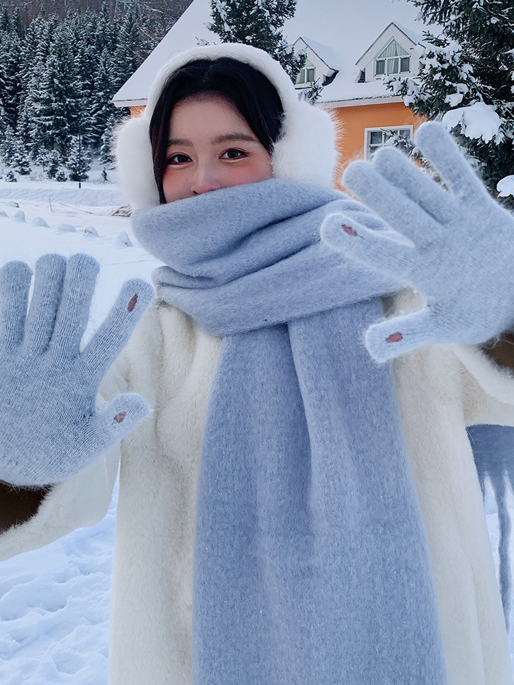 秋と冬の女性のためのライトブルーのスカーフ韓国スタイルの雰囲気の高級手袋東北防寒ハルビン雪スカーフ