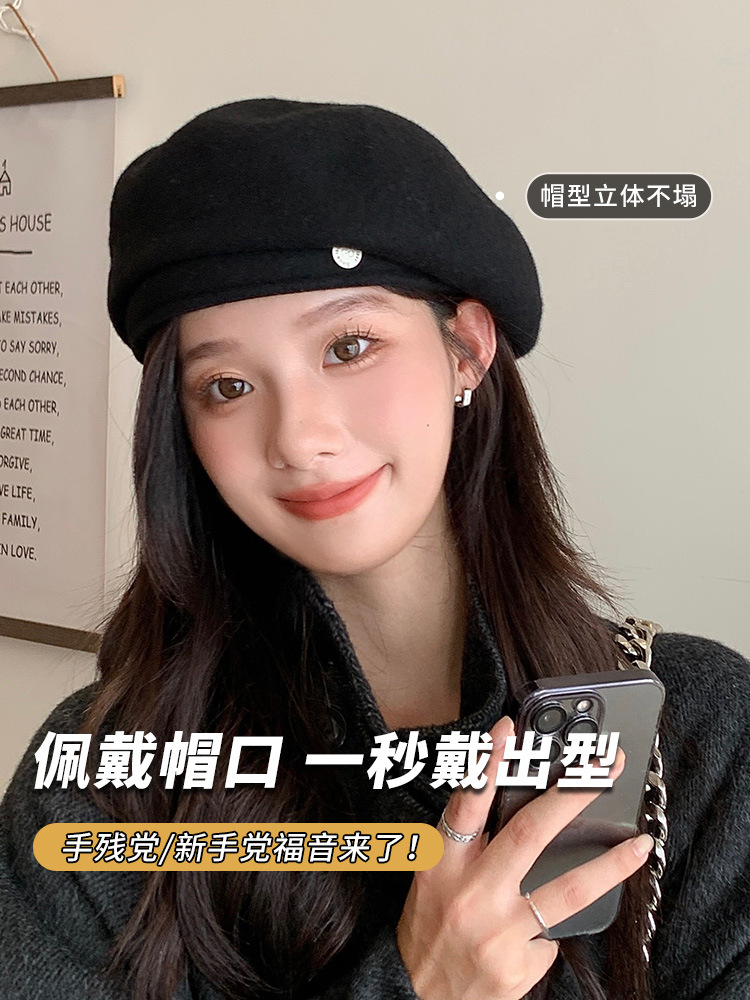 女性用スタイリッシュベレー帽 2025 新しい和風ウール春、秋、冬の大きな頭囲の画家の八角形帽子