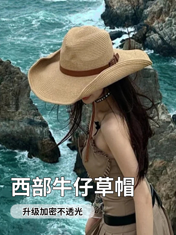 ウエスタンカウボーイ大きなつばの麦わら帽子女性用夏の海辺のビーチ日焼け止め折りたたみ屋外登山日よけ帽子男性用