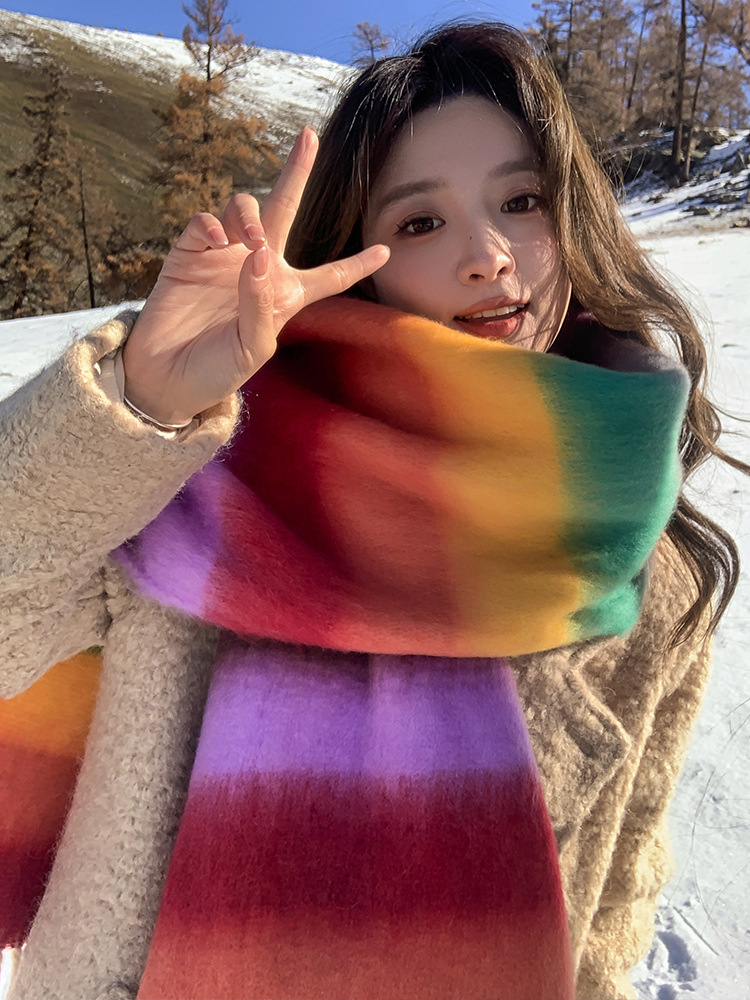 カラフルなモヘアスカーフ冬の女性のハイエンド韓国雰囲気日本のレインボーストライプ超ロングファーボールスカーフ