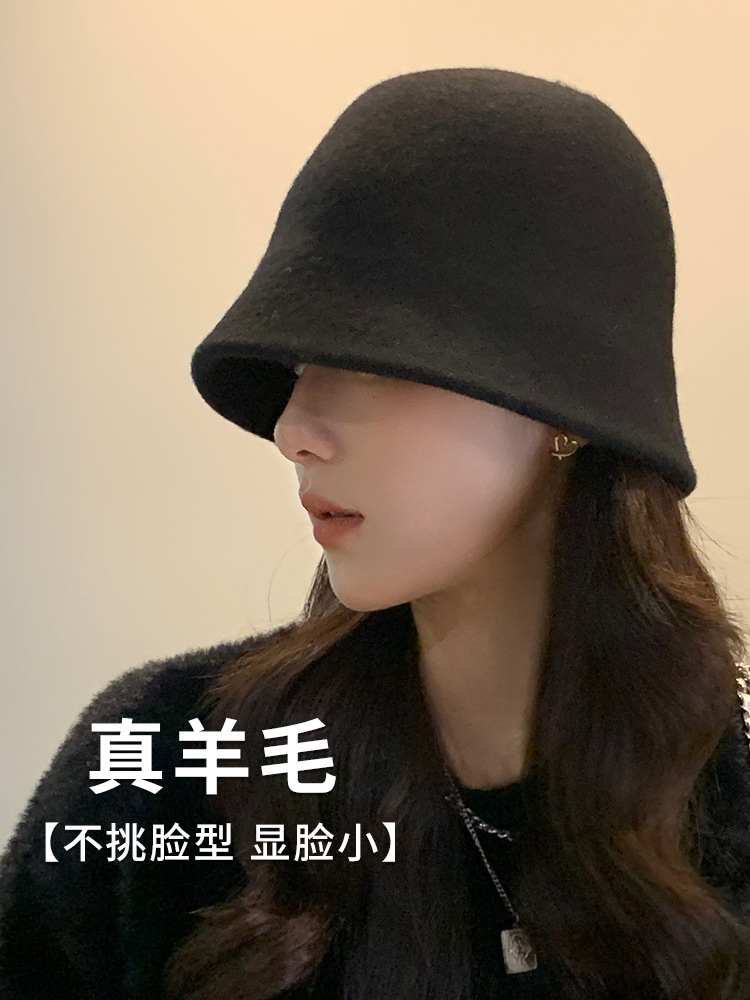 秋と冬の女性のためのハイエンドの漁師の帽子ウール黒の気質冬暖かい盆地帽子顔を示す小さなバケツ帽子