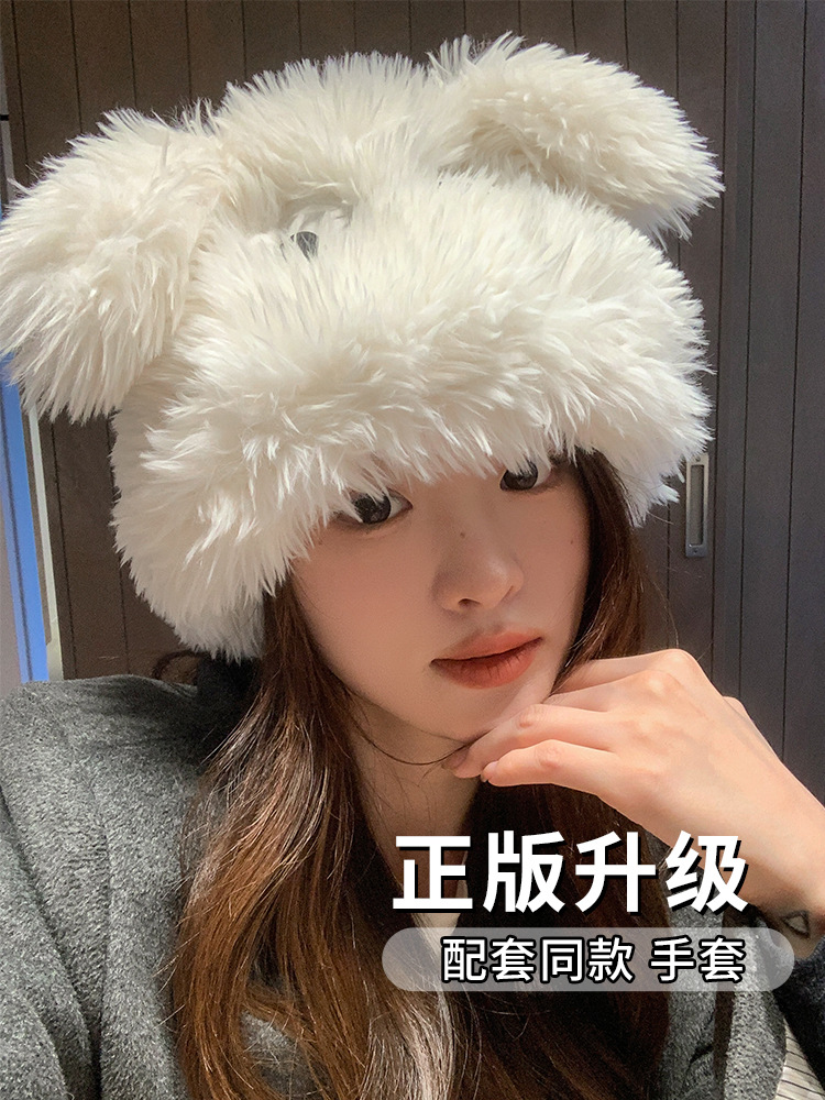 秋冬の女性用ぬいぐるみ子犬帽子、かわいい耳と大きな目、毛皮のような冬、厚くて暖かい、面白い漁師の帽子