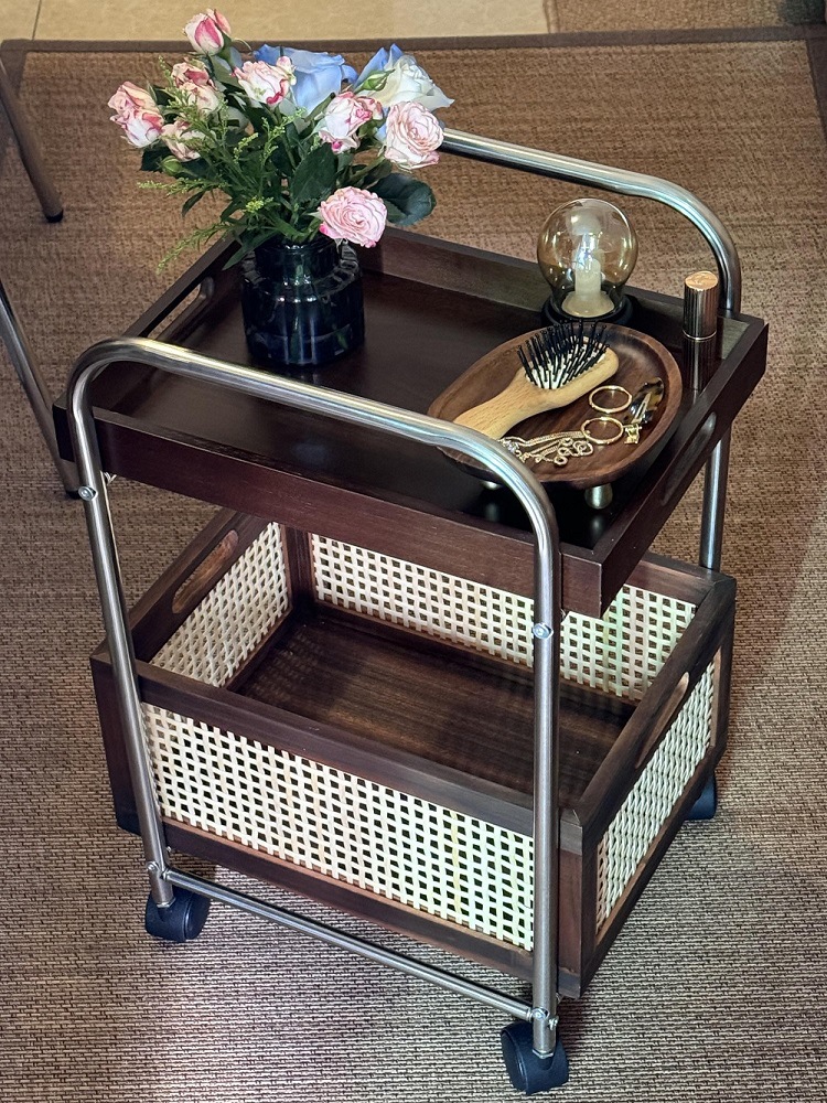 無垢材の可動サイドテーブル収納中古トロリーリビングルームコーヒーテーブル収納ラックスナック収納ラック籐織りレトロ