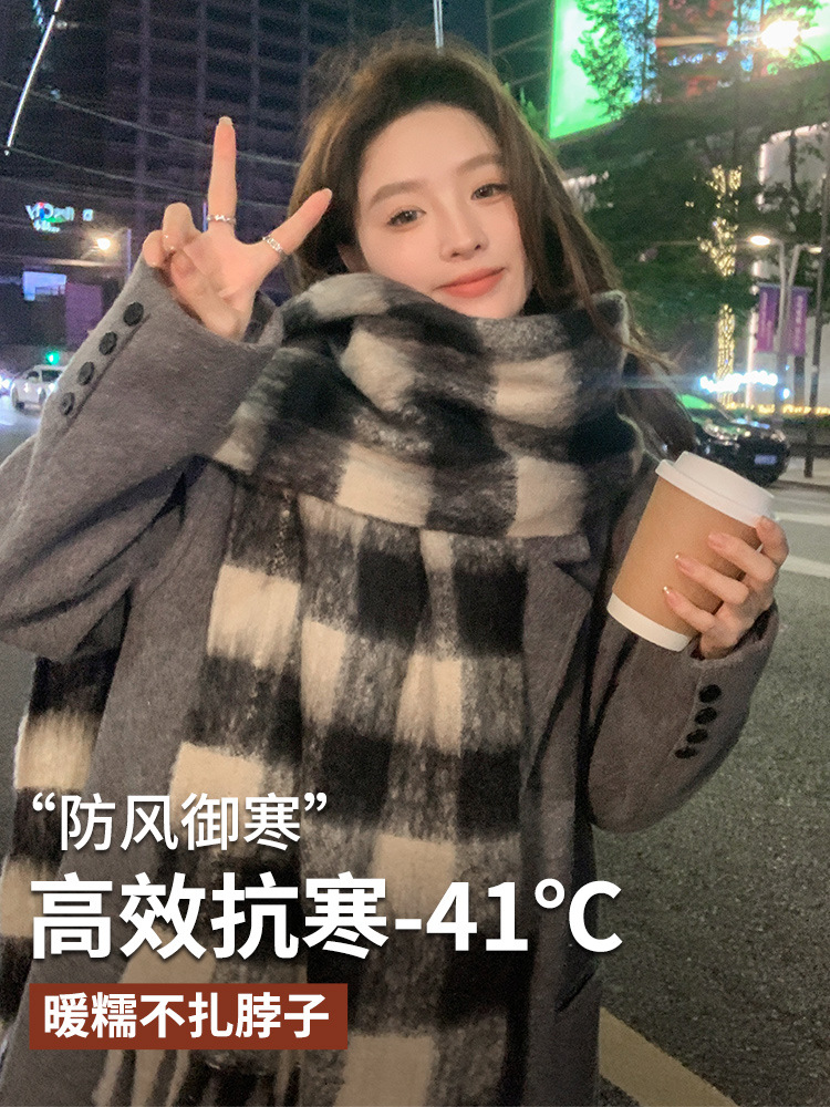 黒と白のチェック柄スカーフ女性のための冬 2025 新しいハイエンドモヘア特大ロング厚く暖かいスカーフ男性のためのトレンディな