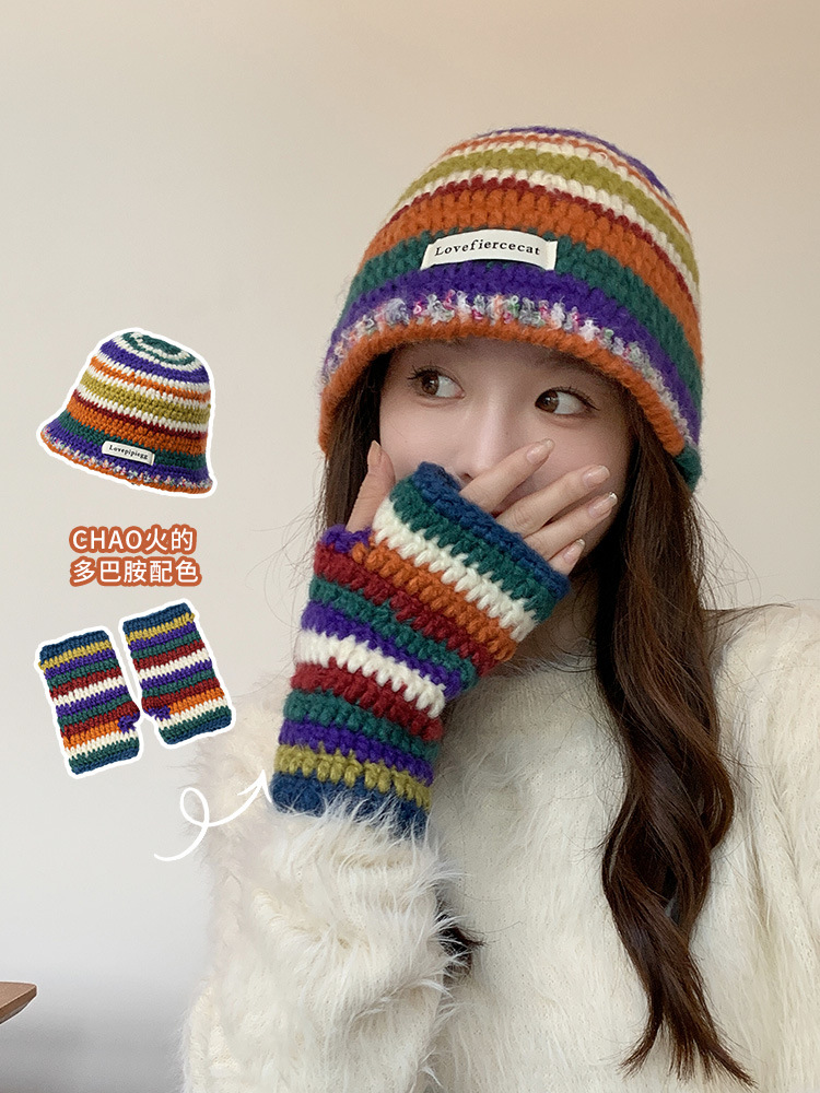 ドーパミンウール帽子女性の秋と冬のカラフルなニットバケツ漁師帽子手織りレトロ日本製防寒帽子