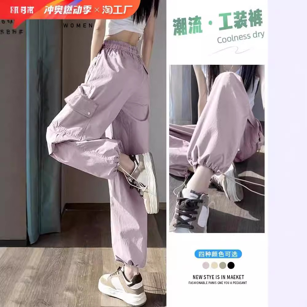 大きいサイズの薄いタイプのアメリカ式の工装のズボンの女性の春の夏の新型の高腰のゆったりしている速乾のカジュアルな広足の運動のズボンの潮