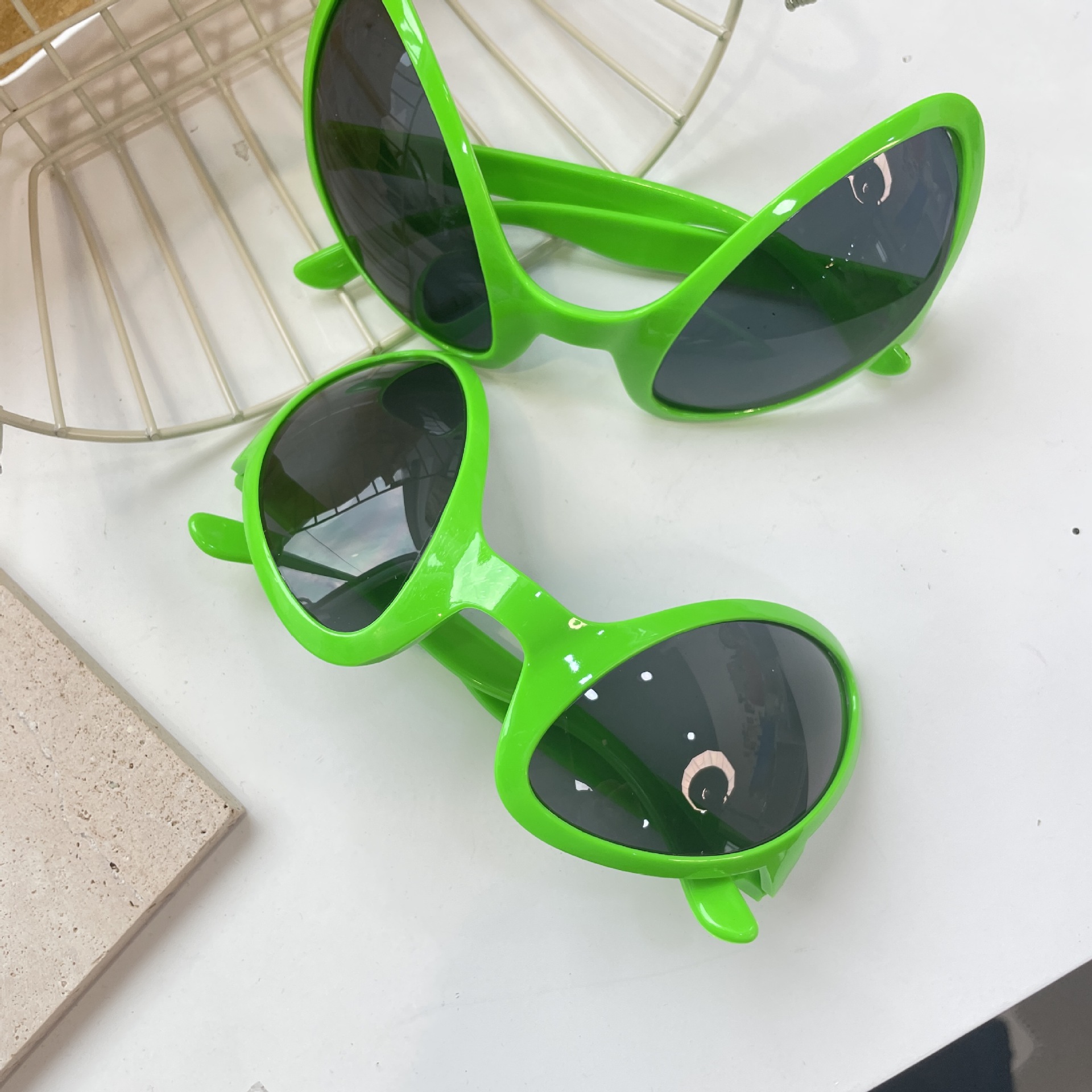 宇宙人の砂の彫刻は怪しいメガネをします。