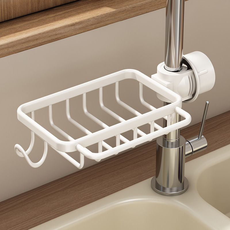 白い台所の蛇口の物置棚の食器洗いの野菜を洗う池の水槽の棚の水たまりのかごのスチールボールのスポンジの収納棚