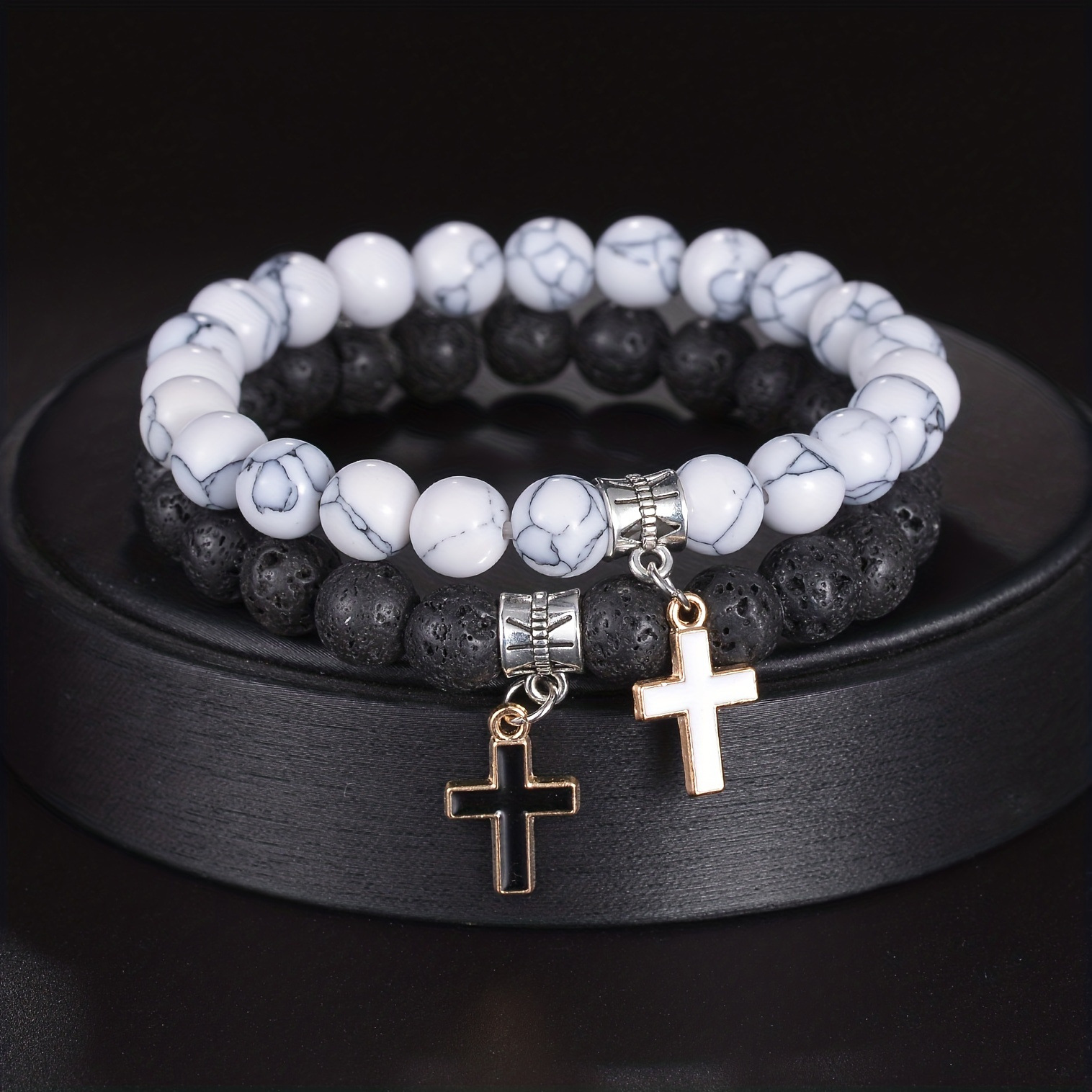 Tume 越境ホットセールホワイトターコイズ火山石ブレスレットクロスペンダントブレスレットトレンディな男性カップル天然石手作り