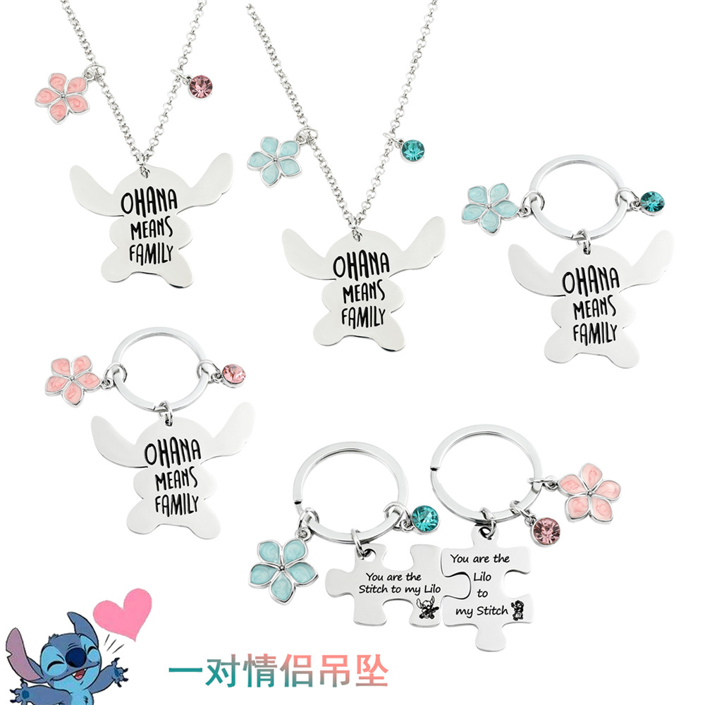 アマゾンの人気スティッチのキーホルダーカップルのペアは、彫刻ネックレスのペンダントカップルのアクセサリー卸売りをつなぎ合わせています。