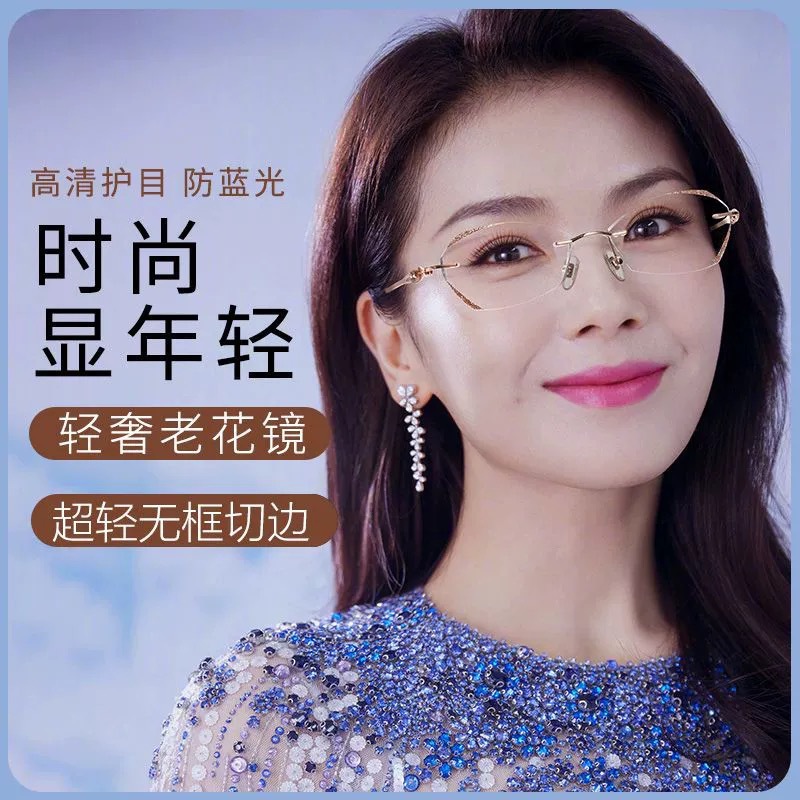 ダイヤモンドフレームレスエッジ2024新作レディース老眼鏡メガネ中高齢者ファッション超軽量hdアンチブルーライト
