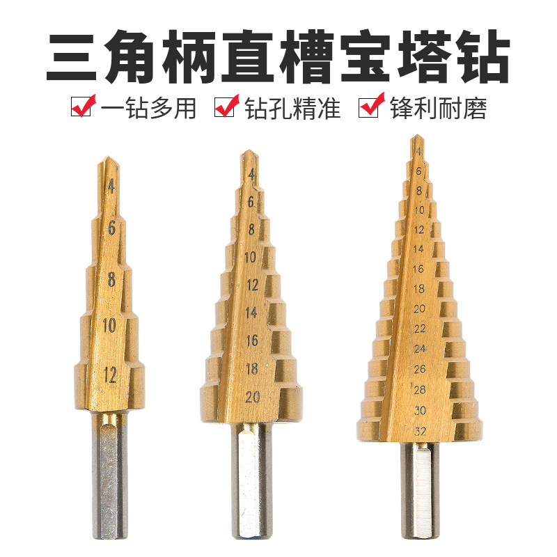 階段ドリル直槽三角柄4-12/4-20/4-32mmチタンメッキ階段ドリル高速鋼宝塔ドリル