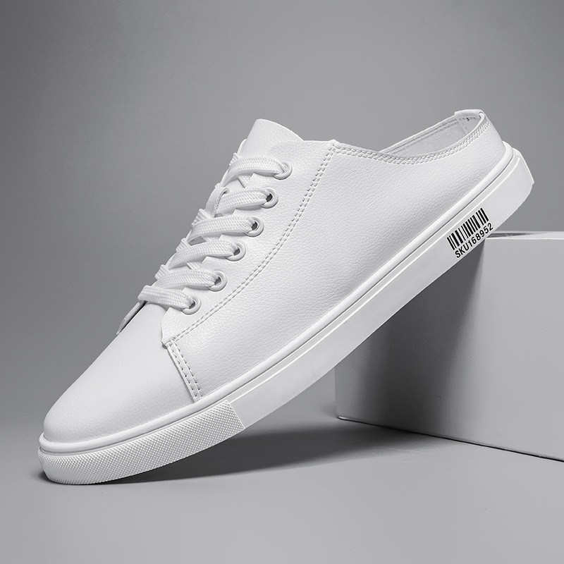 半托怠け者靴男夏通気単層革板靴かかとなしオフィスカジュアル半スリッパ白靴