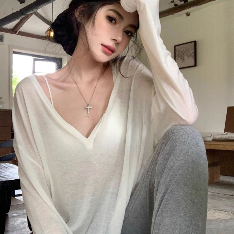 慵懒风宽松防晒罩衫女夏季薄款长袖微透视冰丝恤气质 外搭领上衣