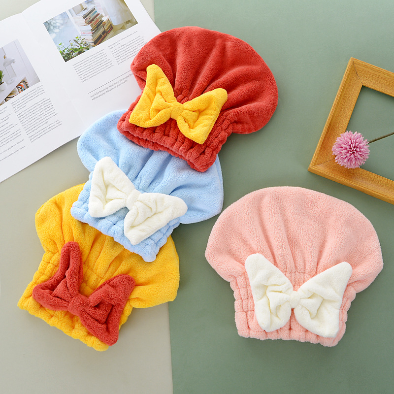 コーラルベルベットヘアドライタオル、強力な吸水性と速乾性のシャワーキャップ、ヘアターバン、厚みのあるかわいいプルオーバーリボンヘアドライキャップ