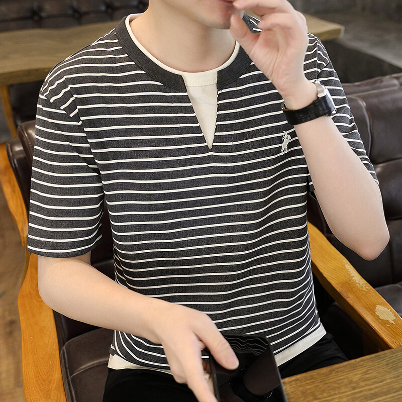 新しい夏のストライプ半袖 T シャツメンズ韓国スタイルトレンディなハンサムで多用途な偽ツーピース若者ラウンドネックトップ T シャツ
