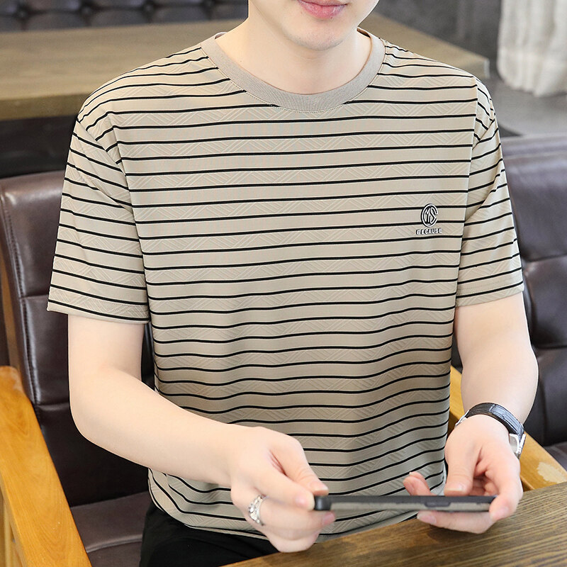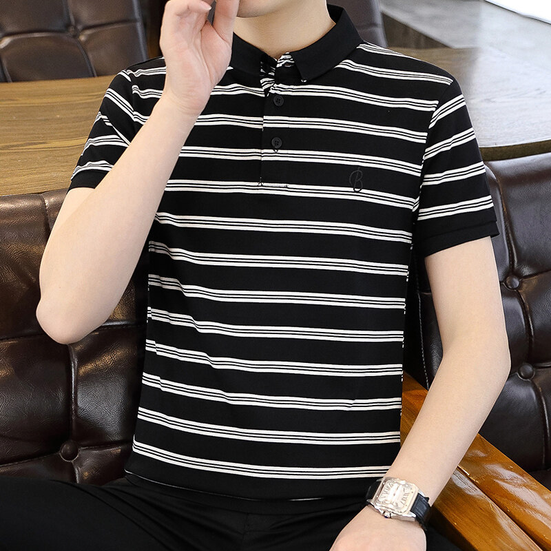 夏ユース半袖ポロシャツメンズ韓国風トレンディハンサム万能スリム通気性ストライプTシャツカジュアルトップ