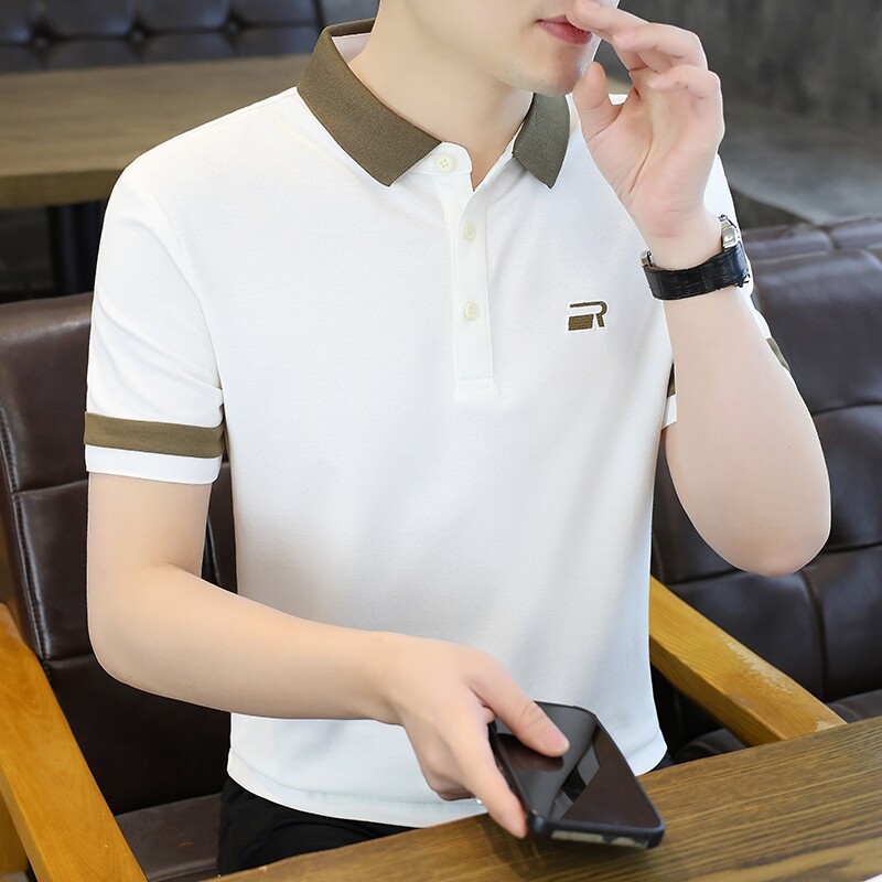 ラペルTシャツメンズ半袖夏トレンドハイエンドコントラストカラーステッチポロシャツメンズ刺繍クール半袖