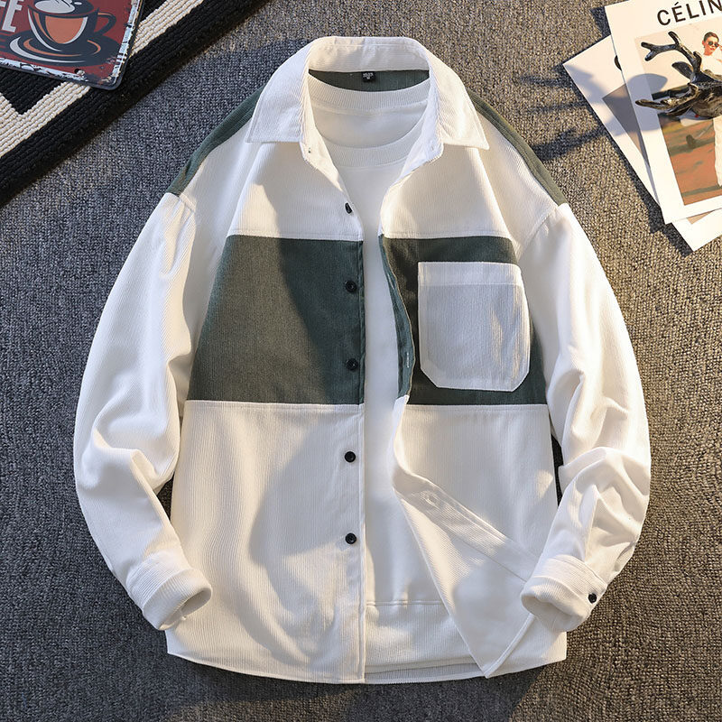 春の新型のつなぎ合わせのシャツの男性のファッションはゆったりしています。