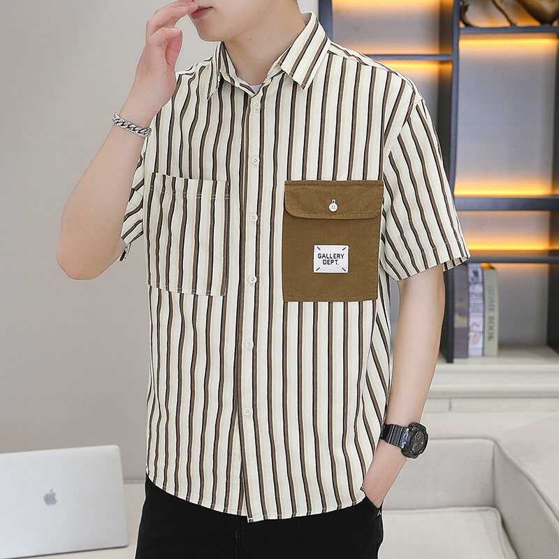 夏の半袖シャツの男性の純綿のストライプのポケットのシャツの青少年の中学生の韓国版は色のカジュアルな上着をつづり合わせます。