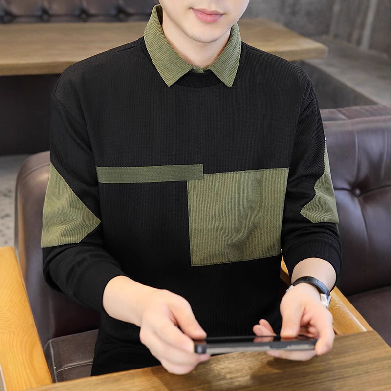 偽のシャツの襟のパーカーの男性の春の新型のカジュアルな高級感の底のシャツの潮は長袖のtシャツの上着をつなぎ合わせます。