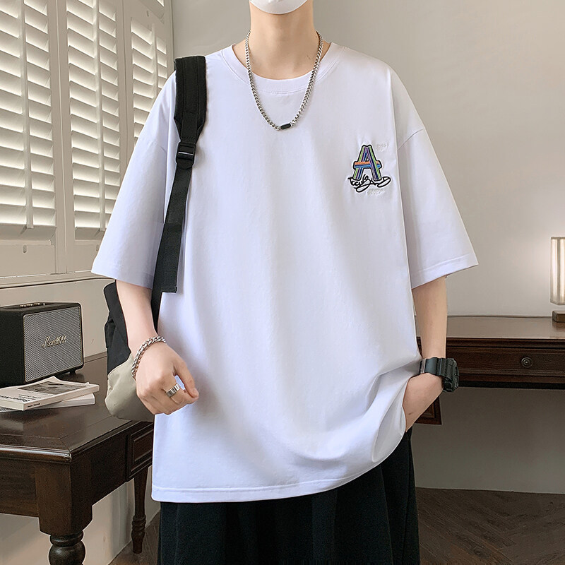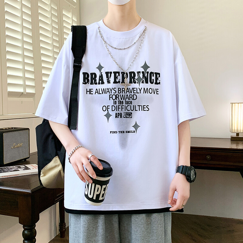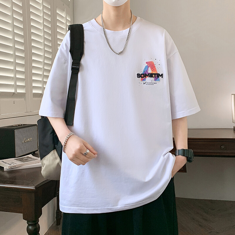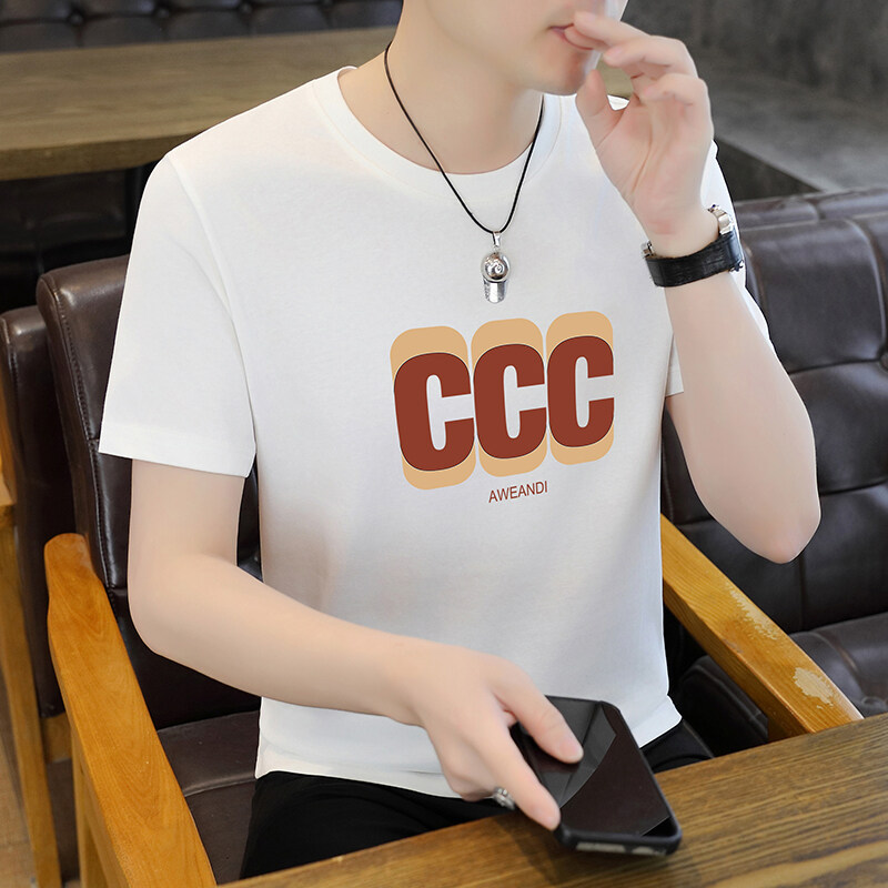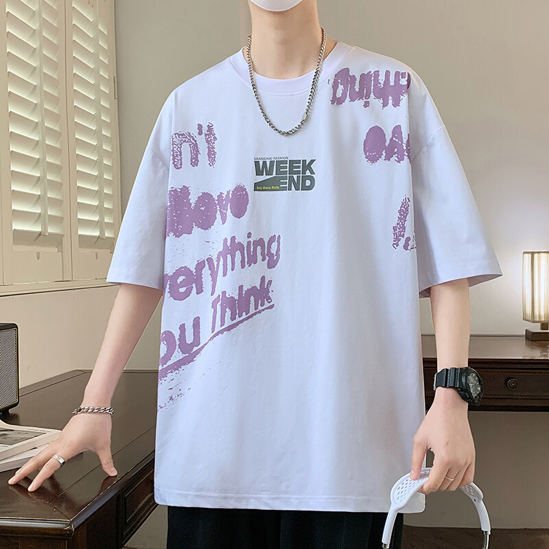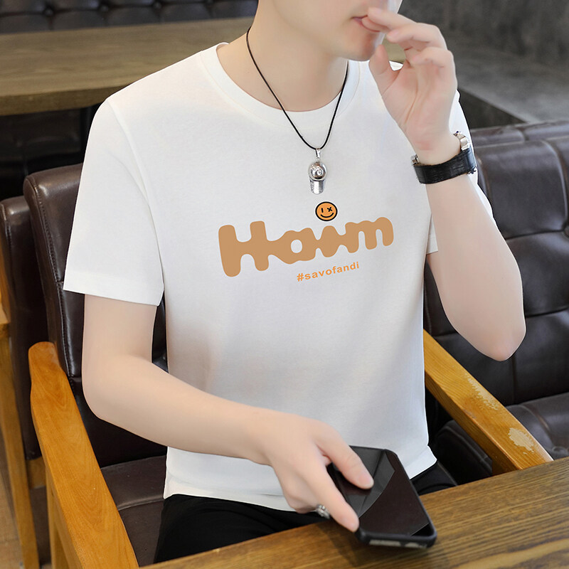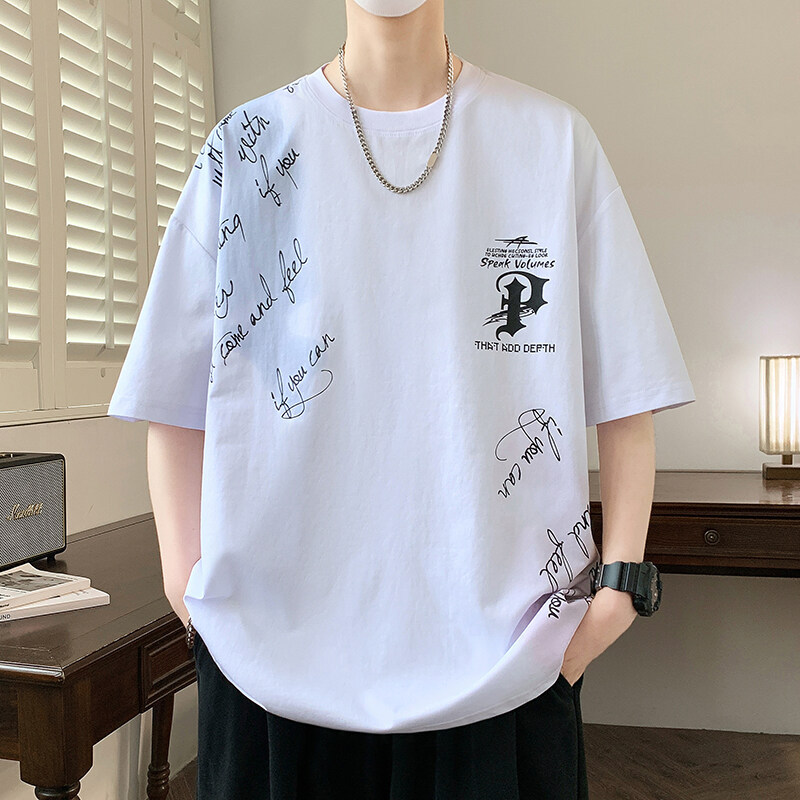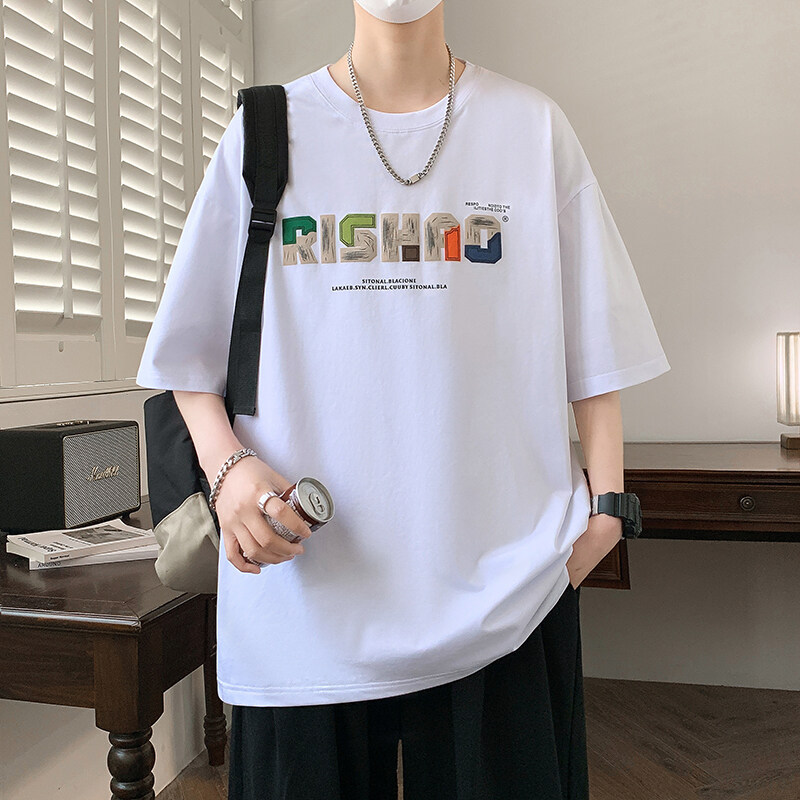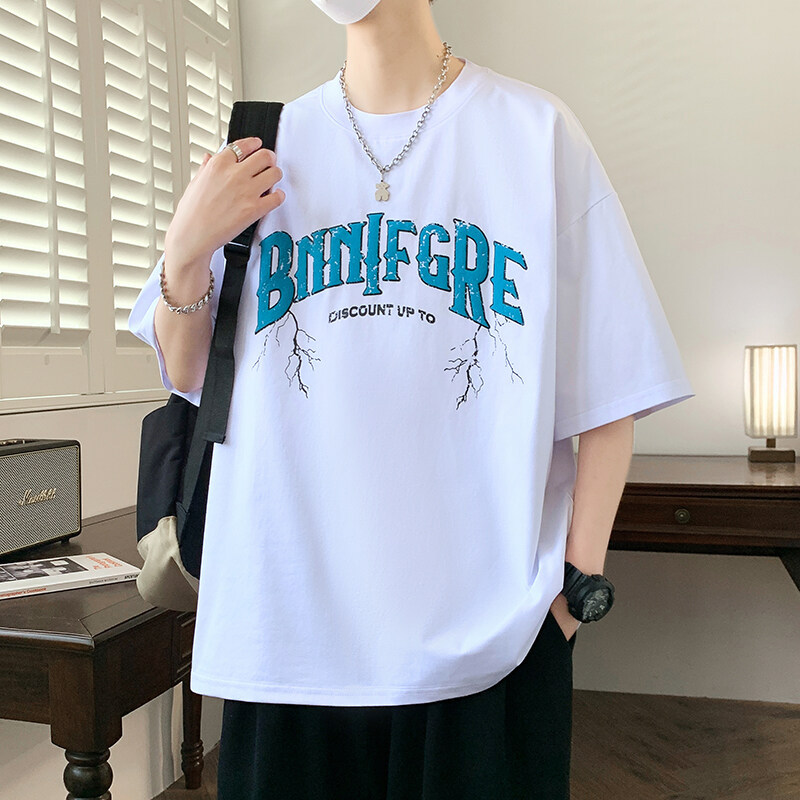 夏の男性用半袖Tシャツ、新しいスタイル、ハンサムでトレンディーな若者向けのルーズラウンドネックプリントレタードTシャツ、多用途トップス